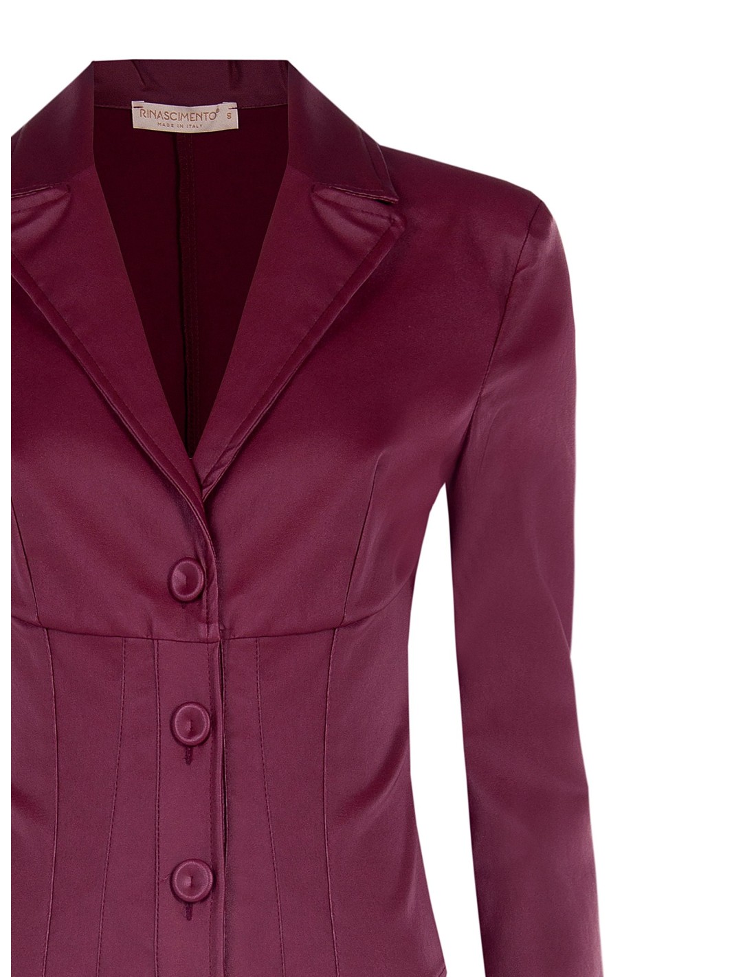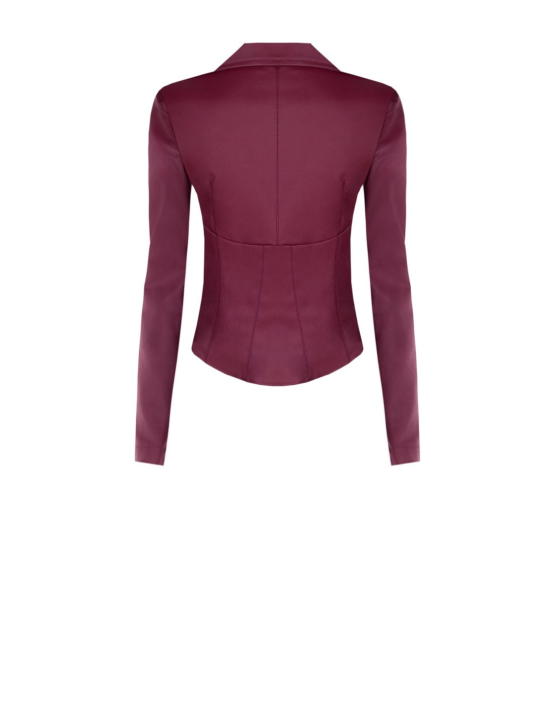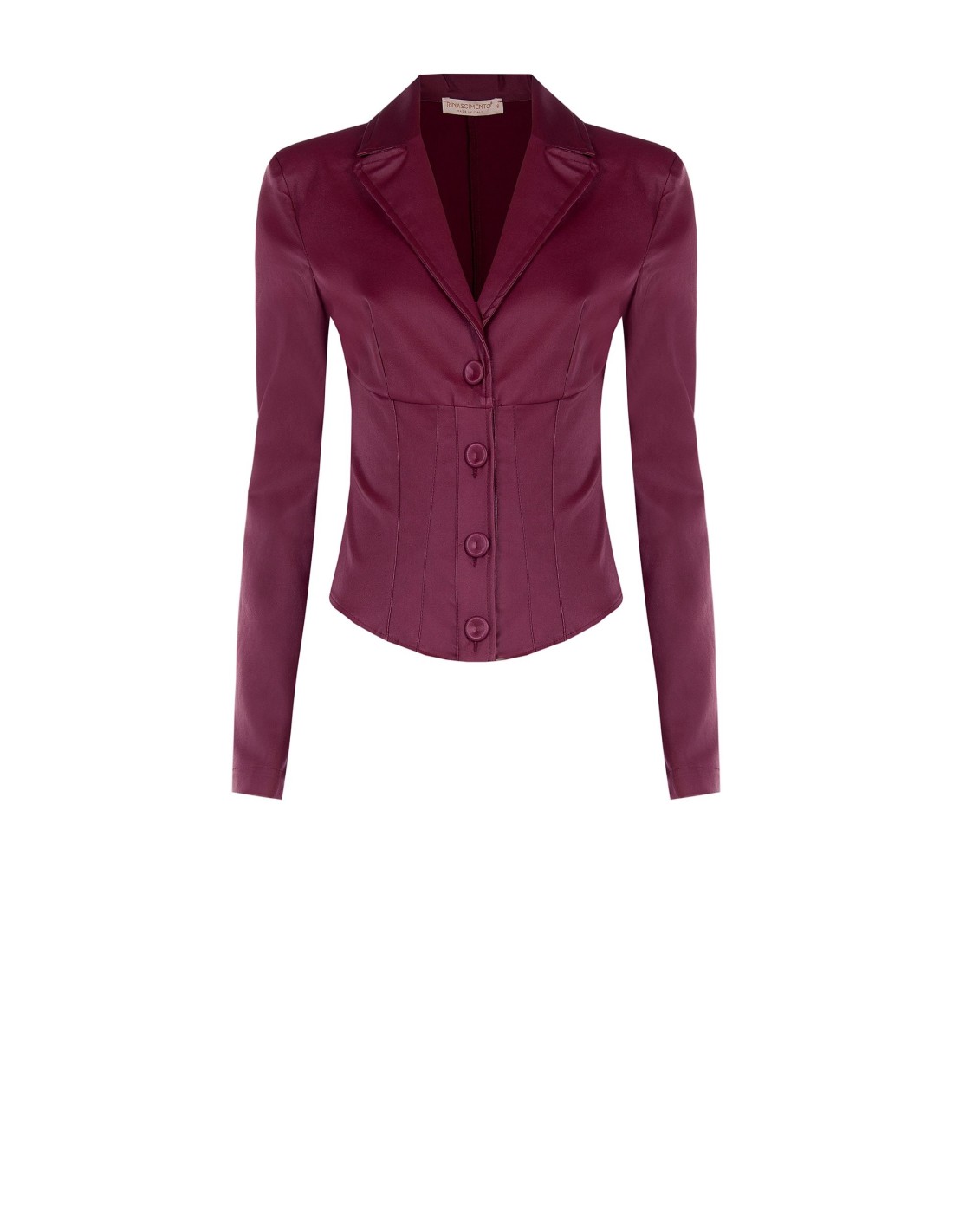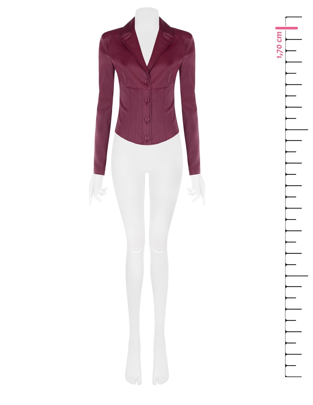 Blazer de alfaiataria com corte justo que esculpe a cintura. Confeccionado em cetim luminoso com toque macio, proporciona conforto e uma silhueta feminina. Lapela clássica, botões forrados e costuras verticais que alongam. Perfeito com calças ou vestidos midi para escritório e aperitivos.