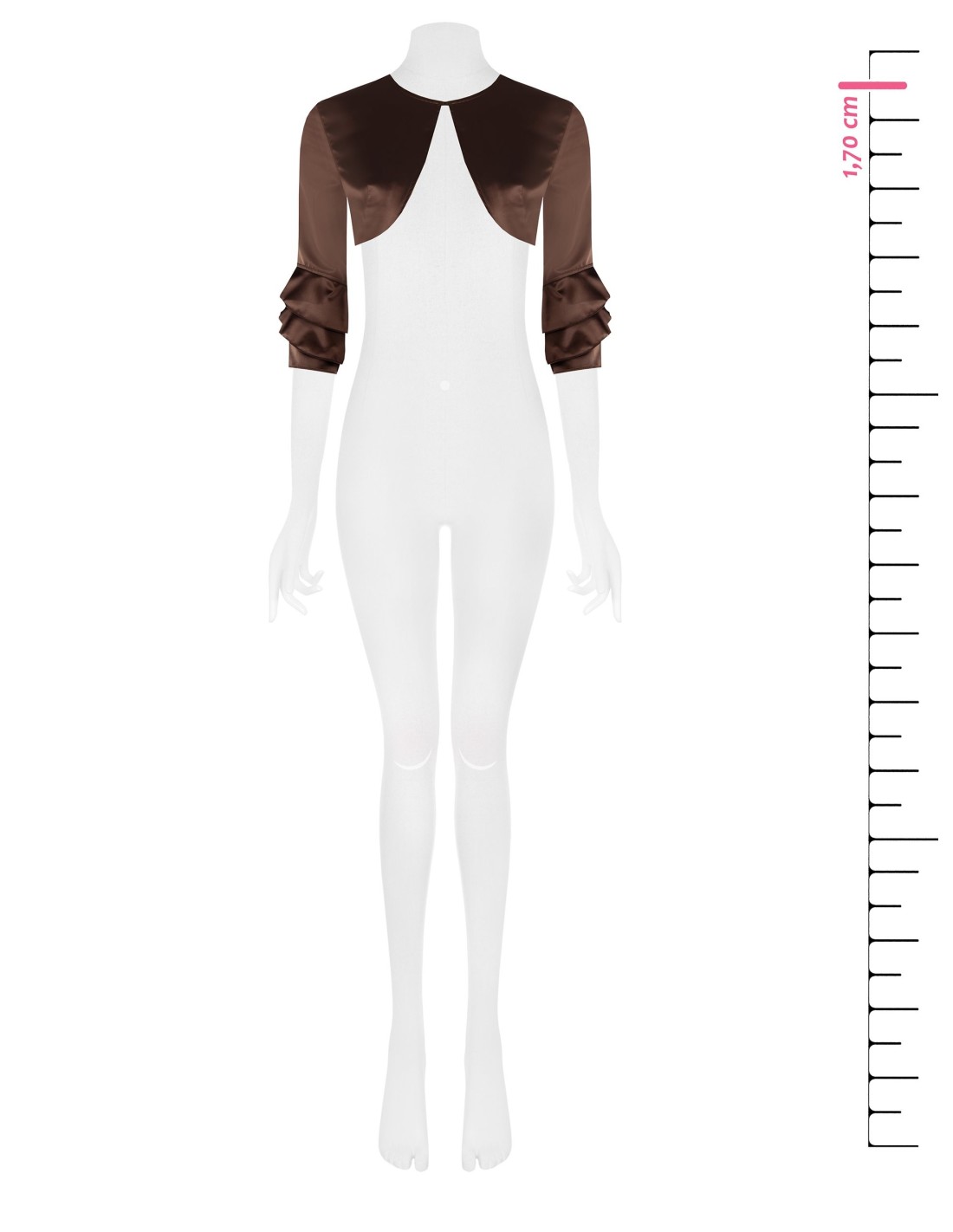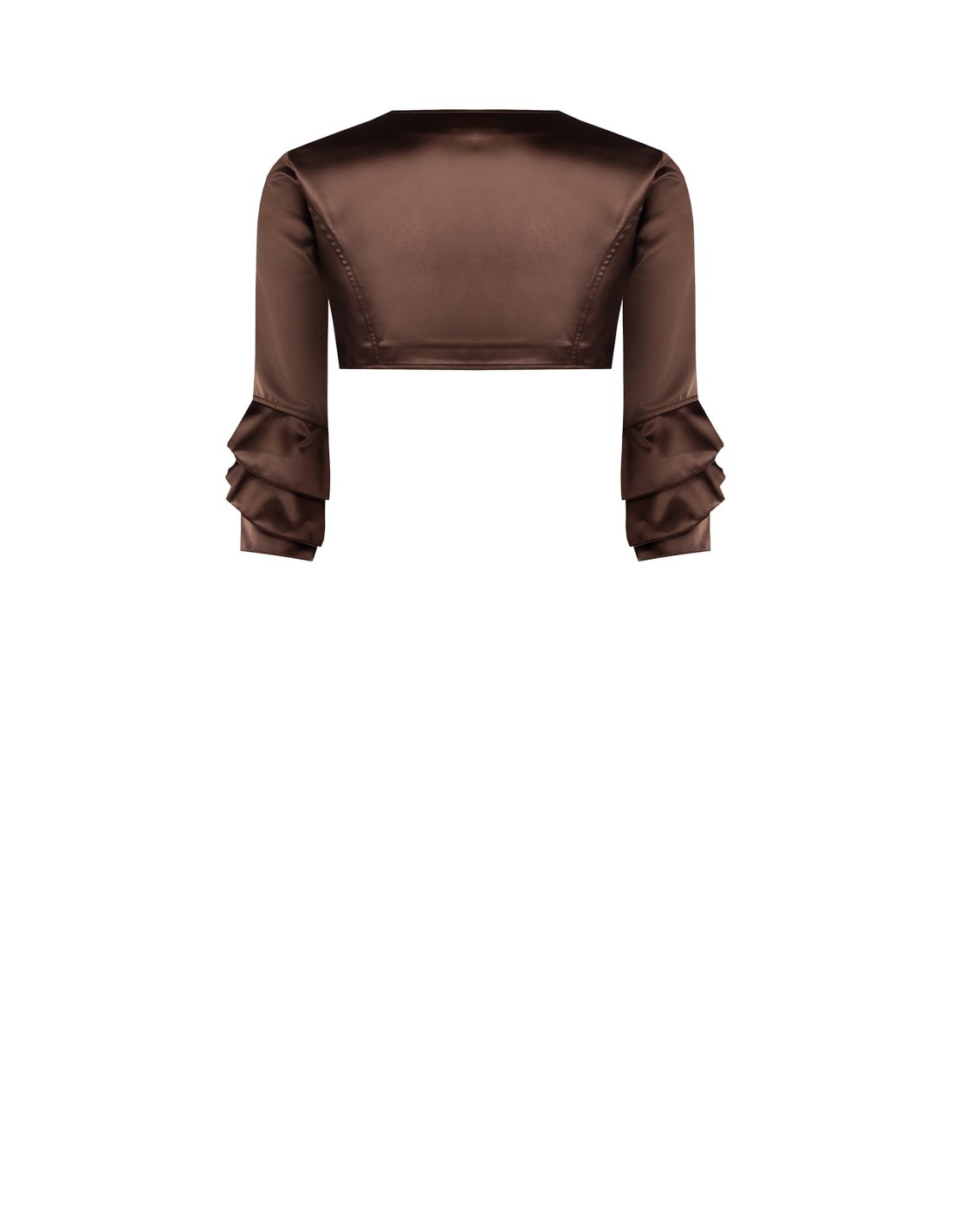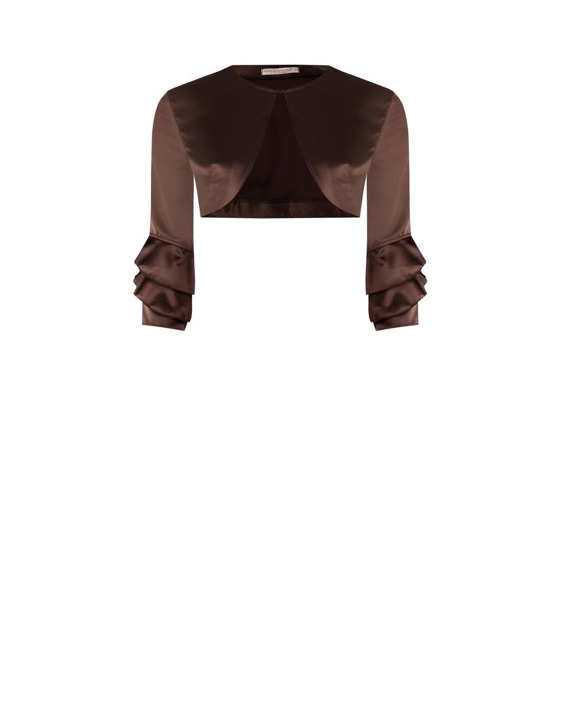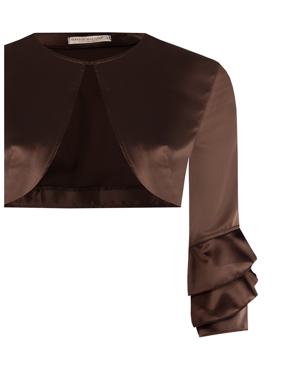 Bolero curto Rinascimento com um corte que favorece a silhueta. Feito de cetim brilhante e confortável, desliza suavemente sobre a pele. Mangas 3/4 com folhos sobrepostos e decote em gota à frente que emagrece. Perfeito sobre vestidos e tops para cerimónias, festas e jantares elegantes.