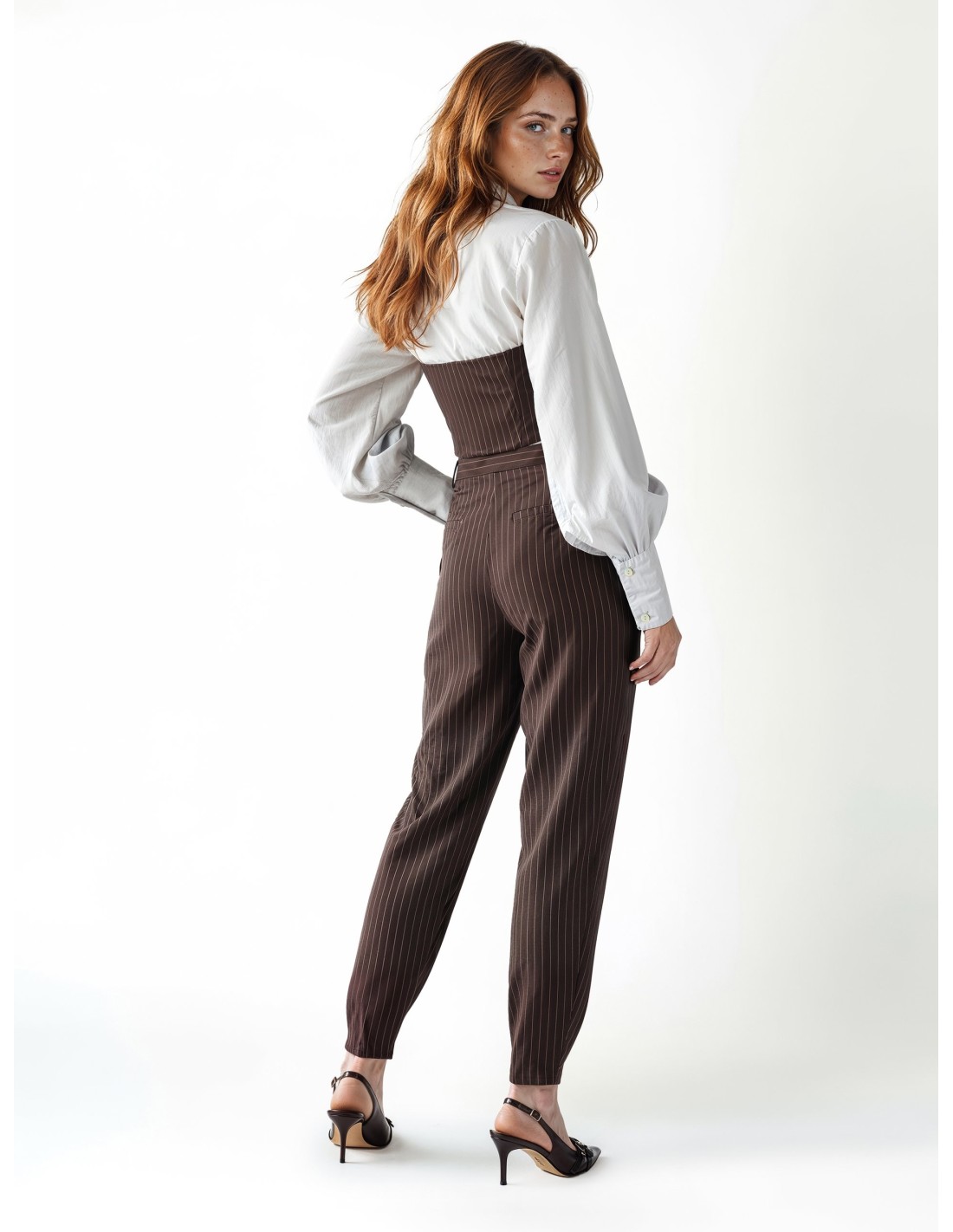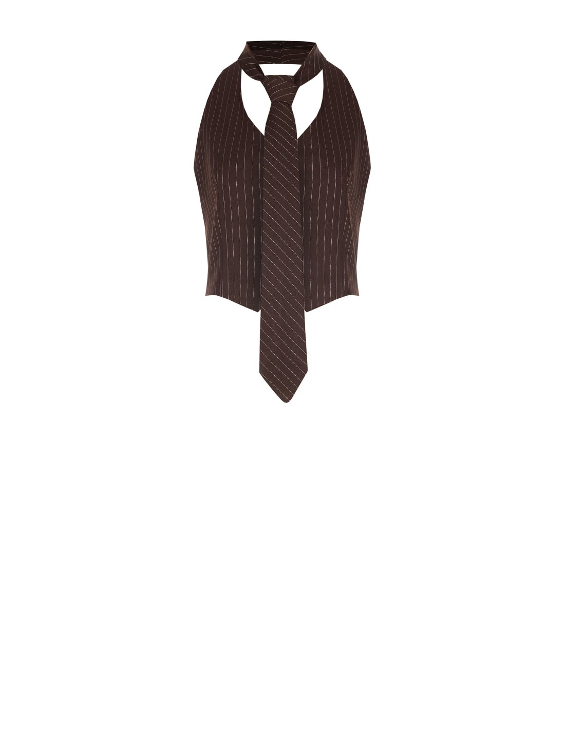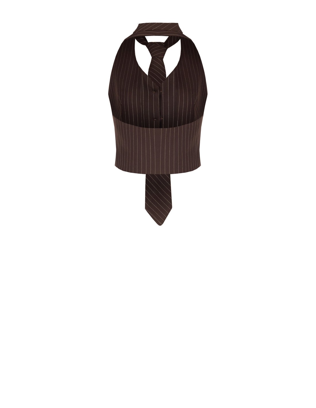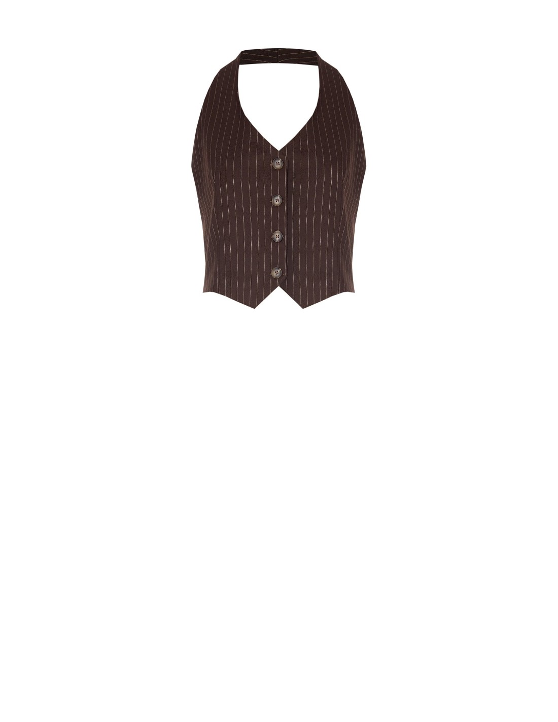 Colete de corte justo que esculpe a silhueta. Tecido fluido risca-de-giz com toque macio para conforto durante todo o dia. Detalhe de gravata removível e decote halter com botões frontais conferem um carácter de alfaiataria. Perfeito para o escritório com blazer ou para um aperitivo com jeans e saltos.