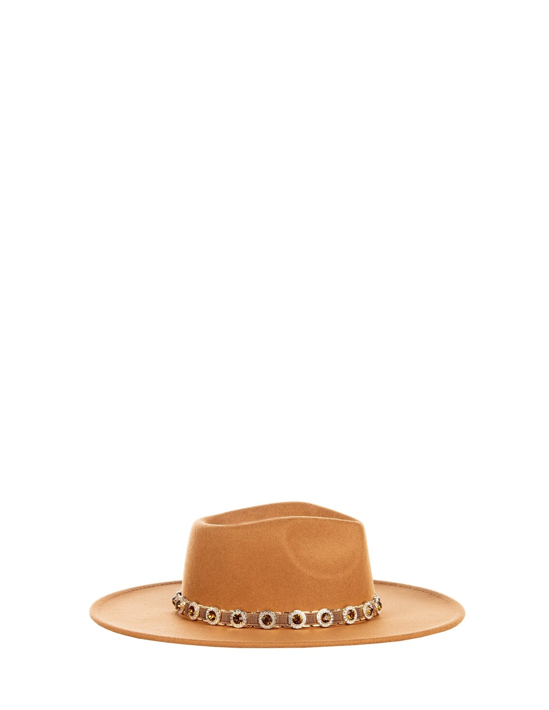 Um chapéu de abas largas com um ajuste estruturado que favorece as feições. Fabricado em feltro macio para maior conforto e fixação, apresenta uma faixa de jóias com strass e pedras montadas numa fita trabalhada. Dá personalidade aos looks do dia a dia e um toque sofisticado aos trajes citadinos, brunchs ou festas à noite. Rinascimento.