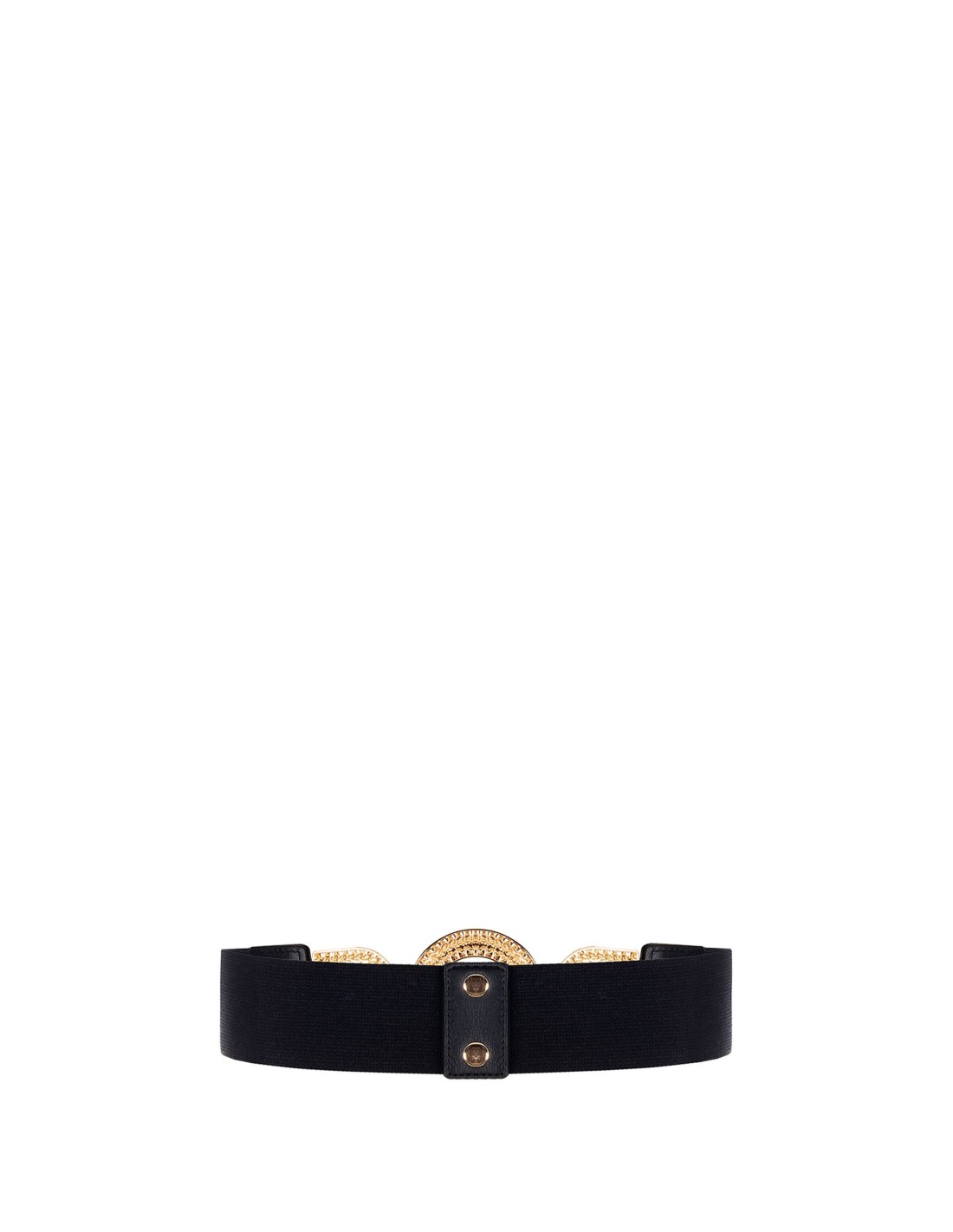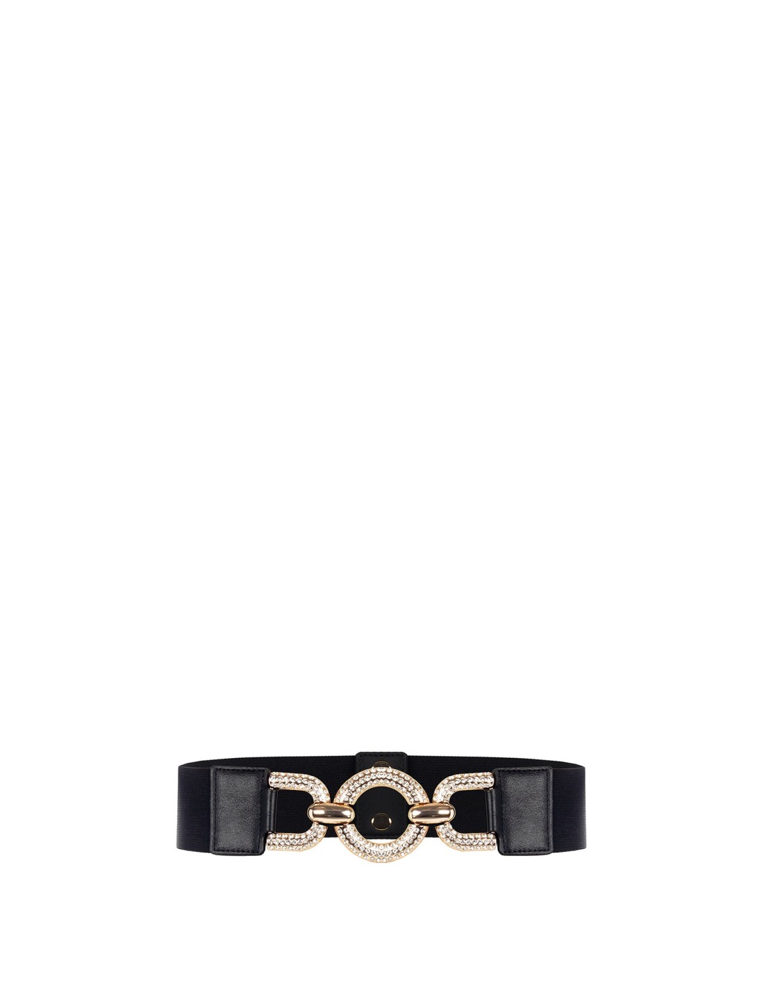 Cinto com elástico que abraça a cintura e valoriza a silhueta. Fita elástica e inserções em imitação de pele, no centro uma fivela redonda com elos em metal e pavé de strass. Fecho de botões de pressão na parte de trás. Perfeita para realçar vestidos e blazers para o escritório, jantares e festas.