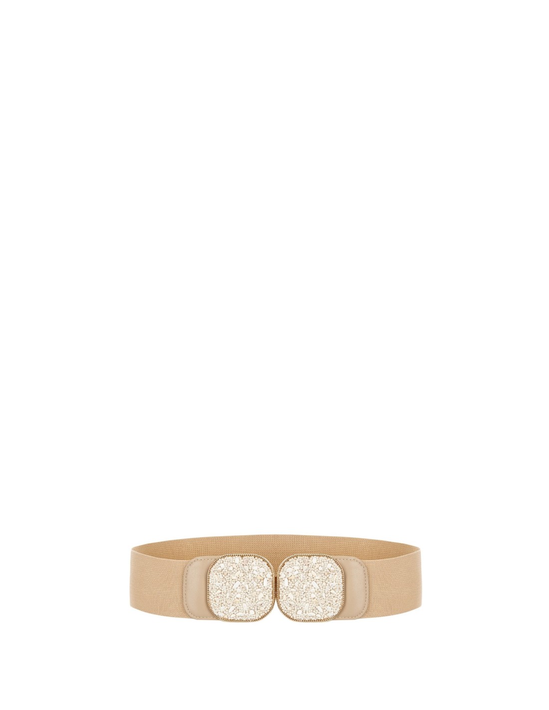Faixa na cintura elástica, envolvente e confortável, que realça a silhueta sem apertar. A frente é enriquecida com um fecho duplo tipo joia com micro-pedras em relevo, para um efeito de luz imediato. Perfeita para vestidos de cerimónia, festas e looks de noite sofisticados.