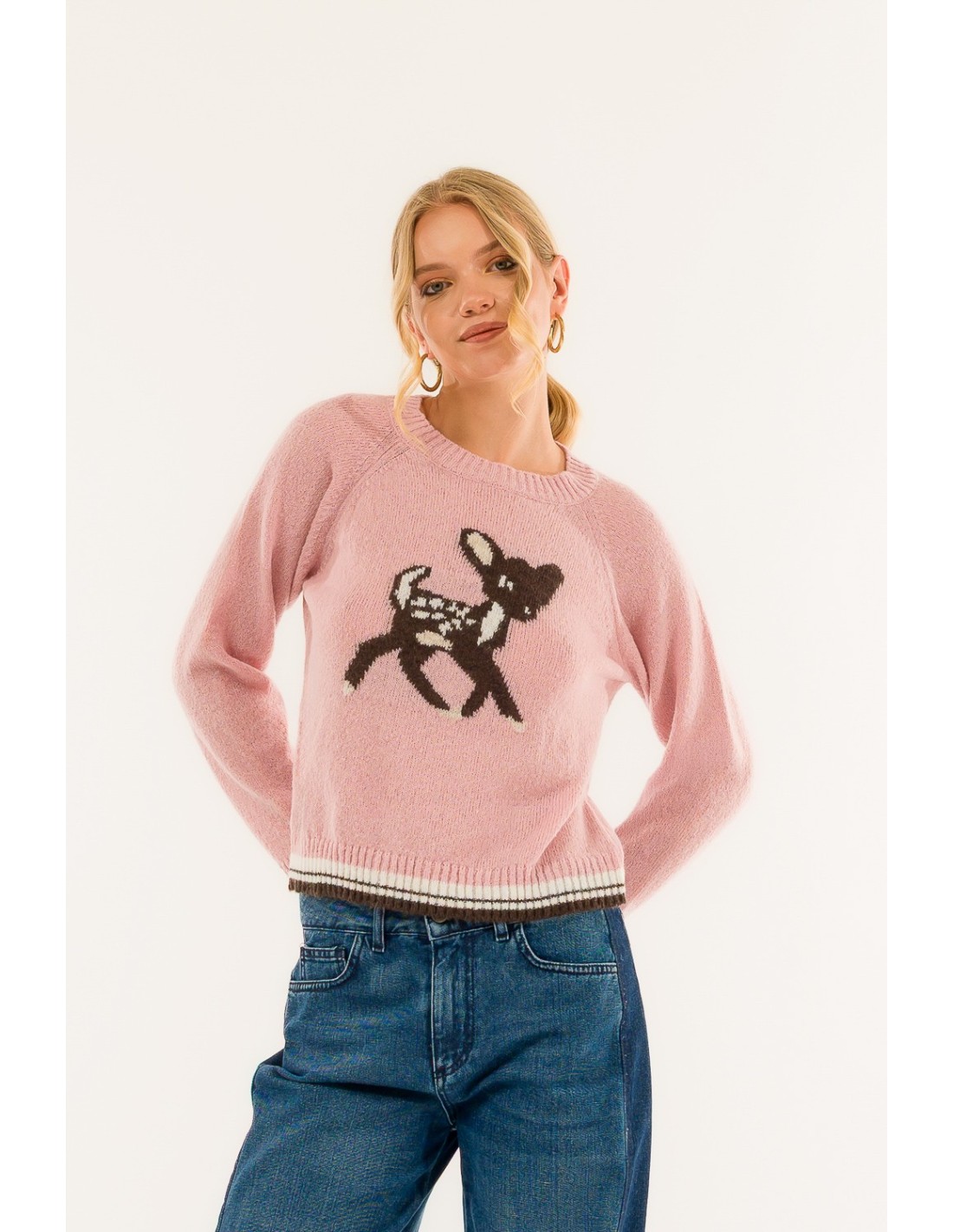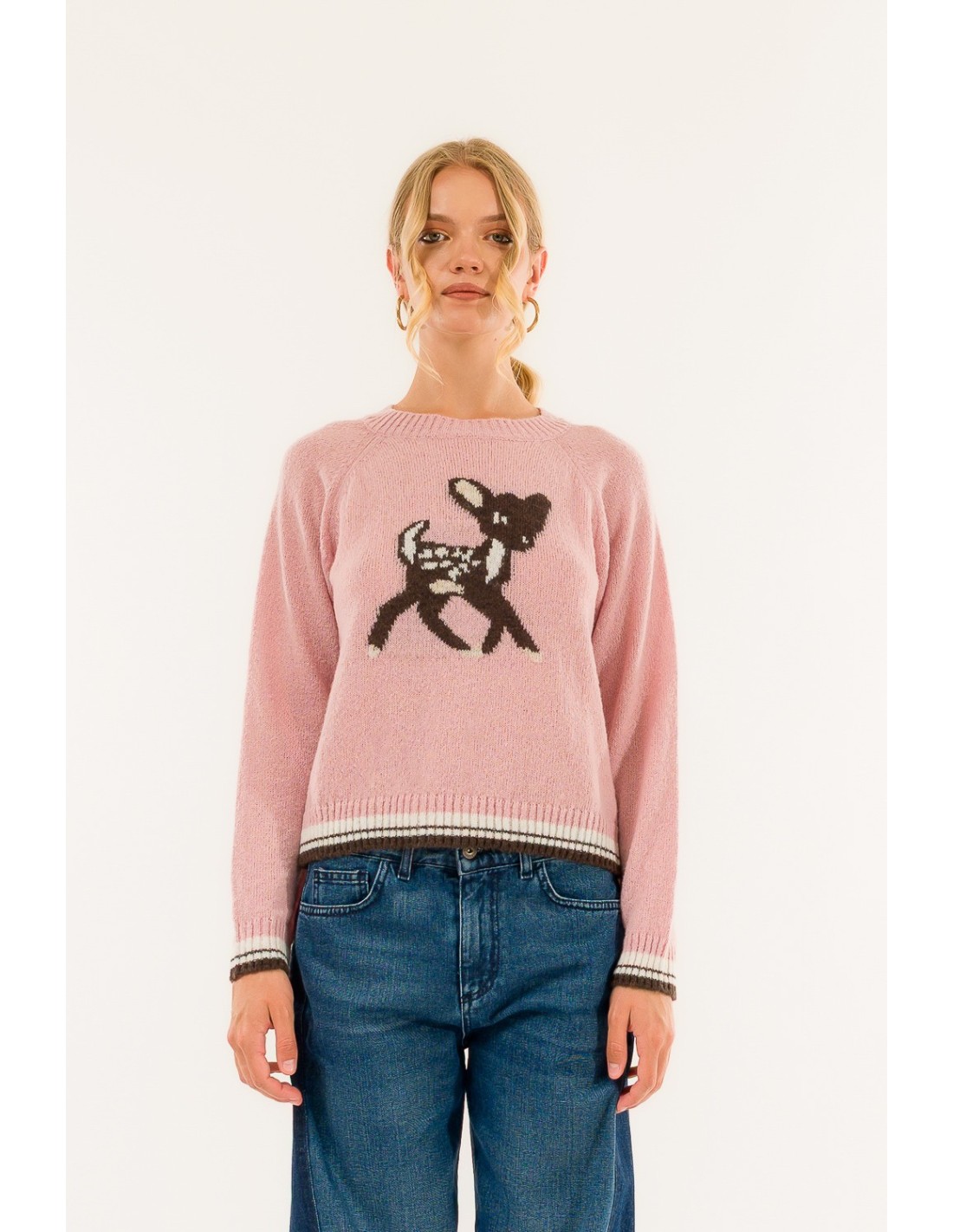 Camisola de ajuste regular e suave Kontatto em fio macio com uma mão peluda. O motivo animal embutido à frente e os rebordos canelados com riscas contrastantes definem a silhueta. Manga raglan para maior liberdade de movimentos. Perfeito para o dia a dia e para o lazer, do denim ao mini.