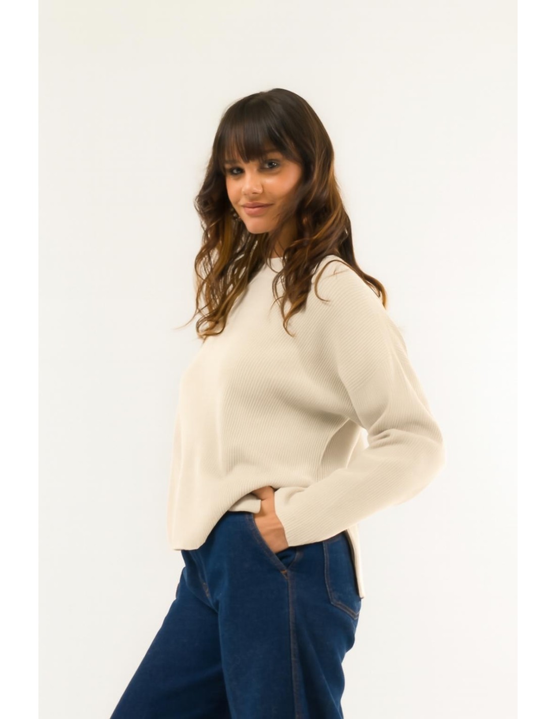 Linhas suaves e detalhes refinados: esta camisola confere elegância sem esforço a todos os conjuntos. O tricô com nervuras e as fendas laterais realçam a silhueta com um gosto contemporâneo. Perfeita para quem gosta de se destacar com estilo e conforto.