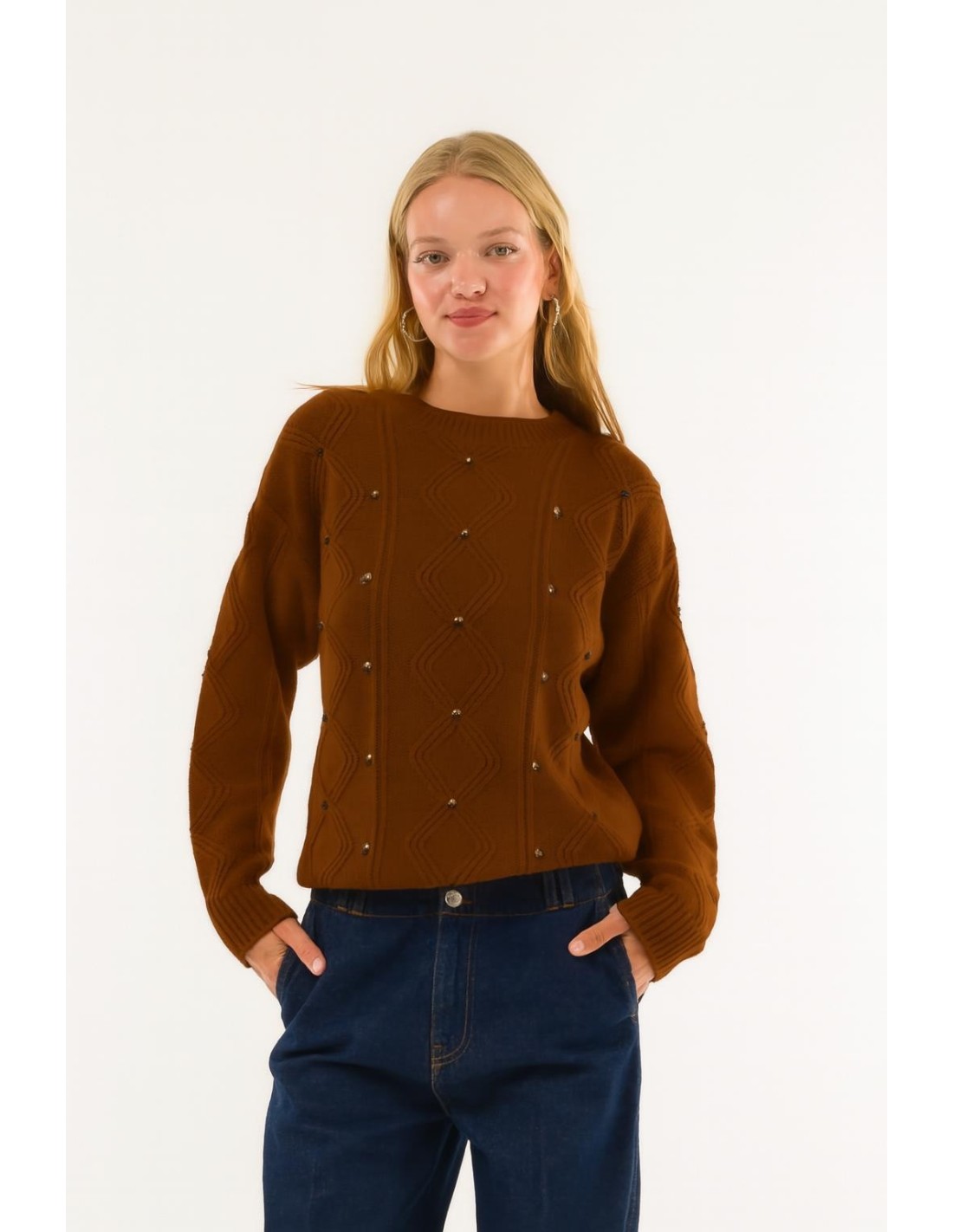 Um tecido geométrico refinado iluminado por delicados detalhes brilhantes: esta camisola embeleza cada roupa com um toque sofisticado e feminino. Perfeita para a acompanhar com elegância em qualquer ocasião.
