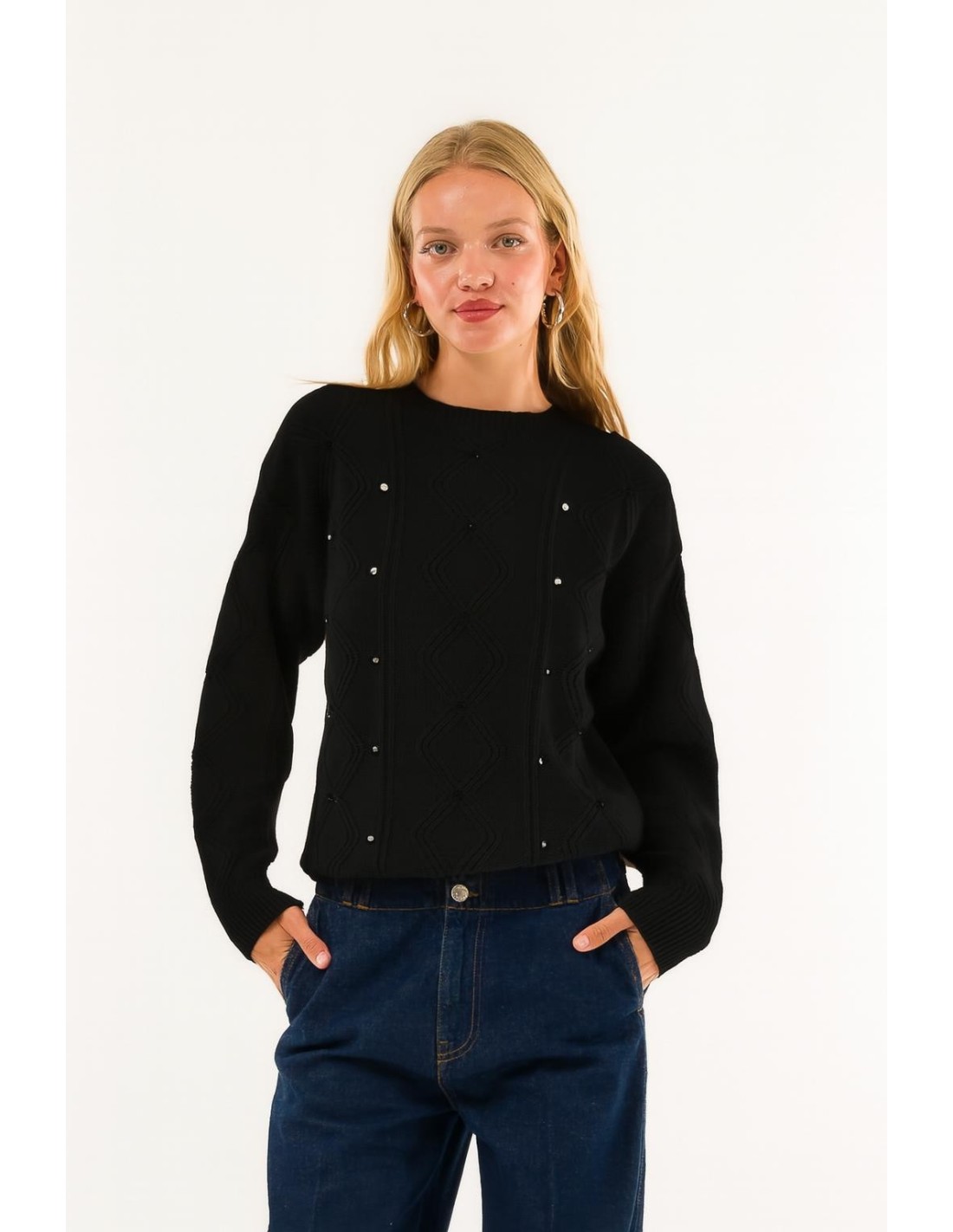 Um tecido geométrico refinado iluminado por delicados detalhes brilhantes: esta camisola embeleza cada roupa com um toque sofisticado e feminino. Perfeita para a acompanhar com elegância em qualquer ocasião.