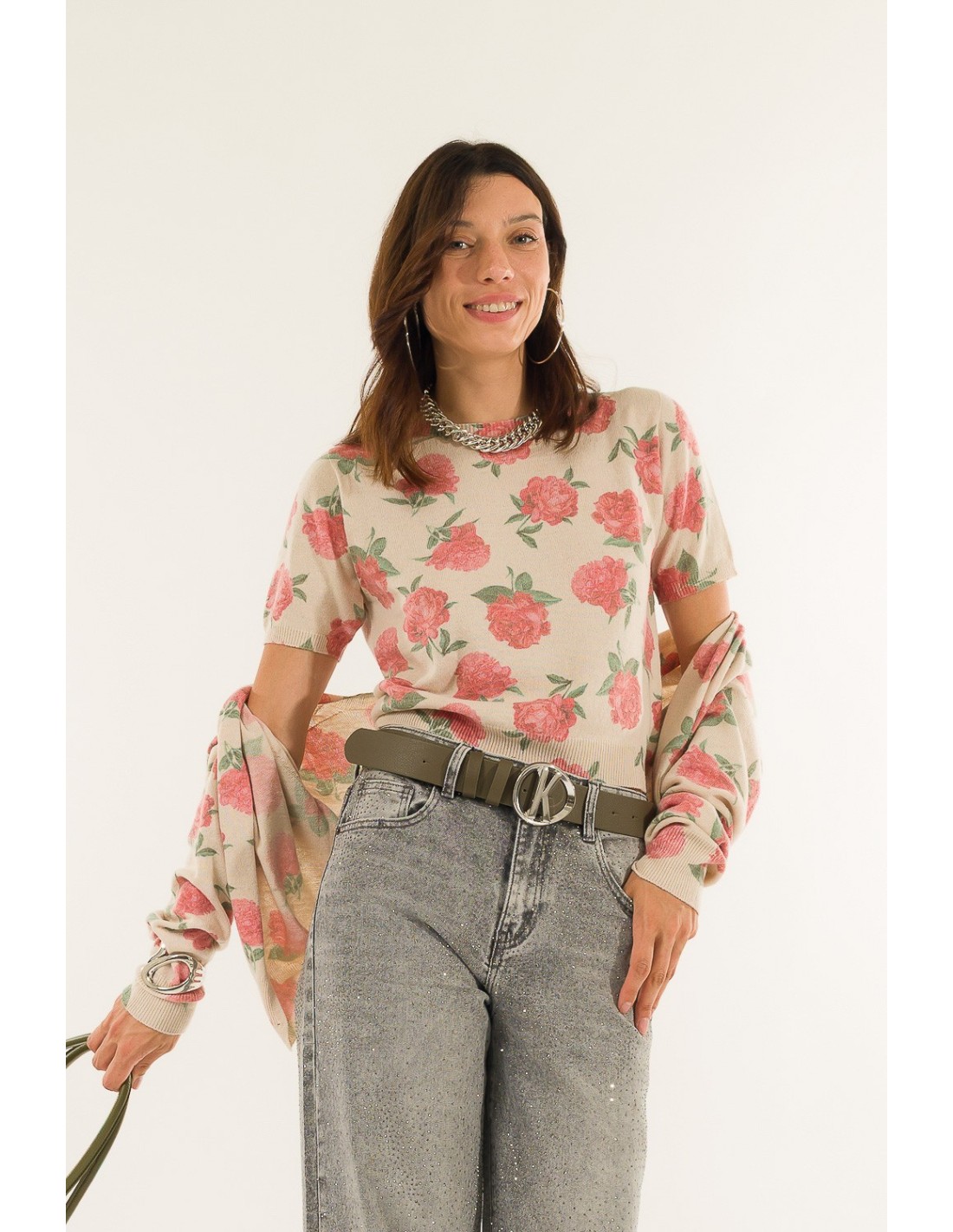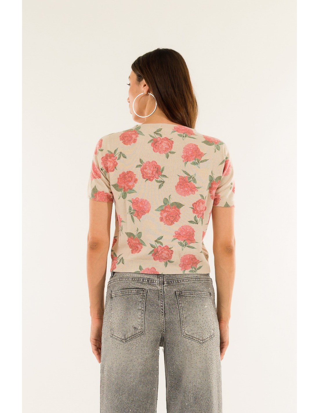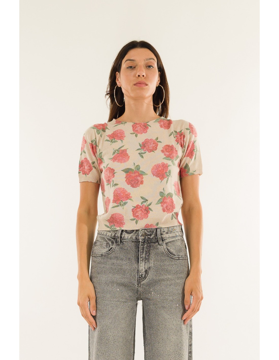 Camisola de manga curta Kontatto, de corte regular que acaricia a silhueta. Fio leve e macio com textura jacquard com padrão floral. Gola redonda limpa, bordos canelados que definem a cintura. Perfeito para o escritório com um blazer ou para usar no dia a dia com calças de ganga e saias.