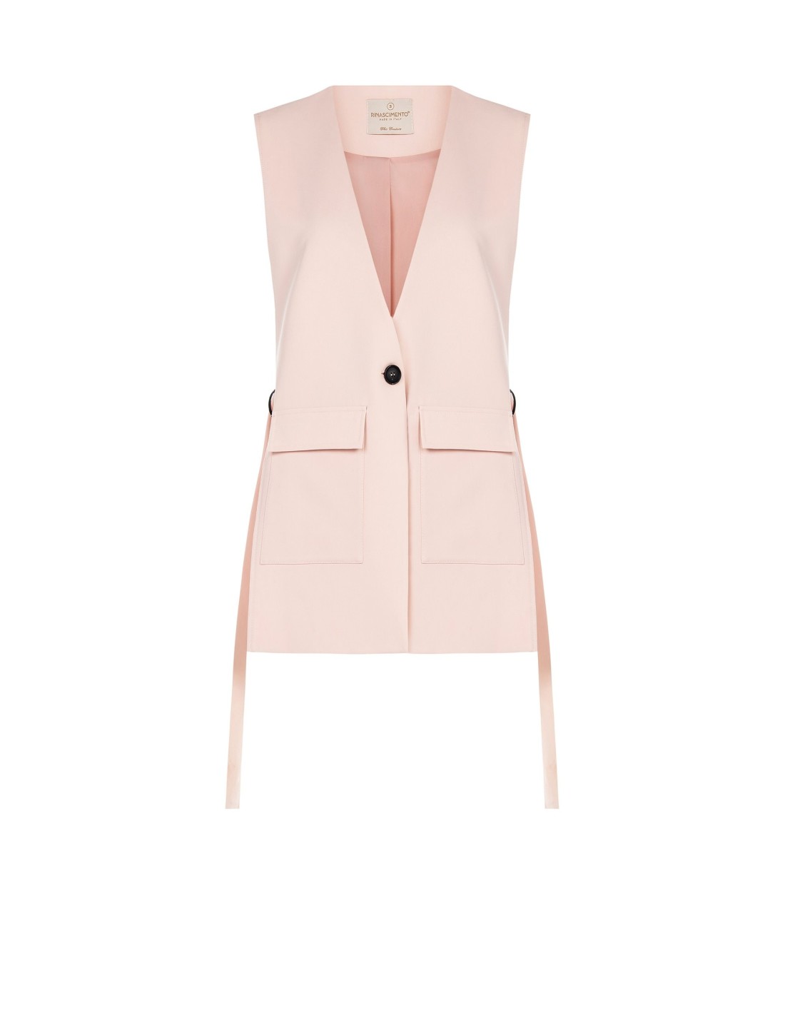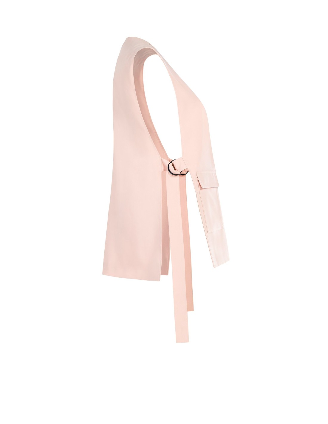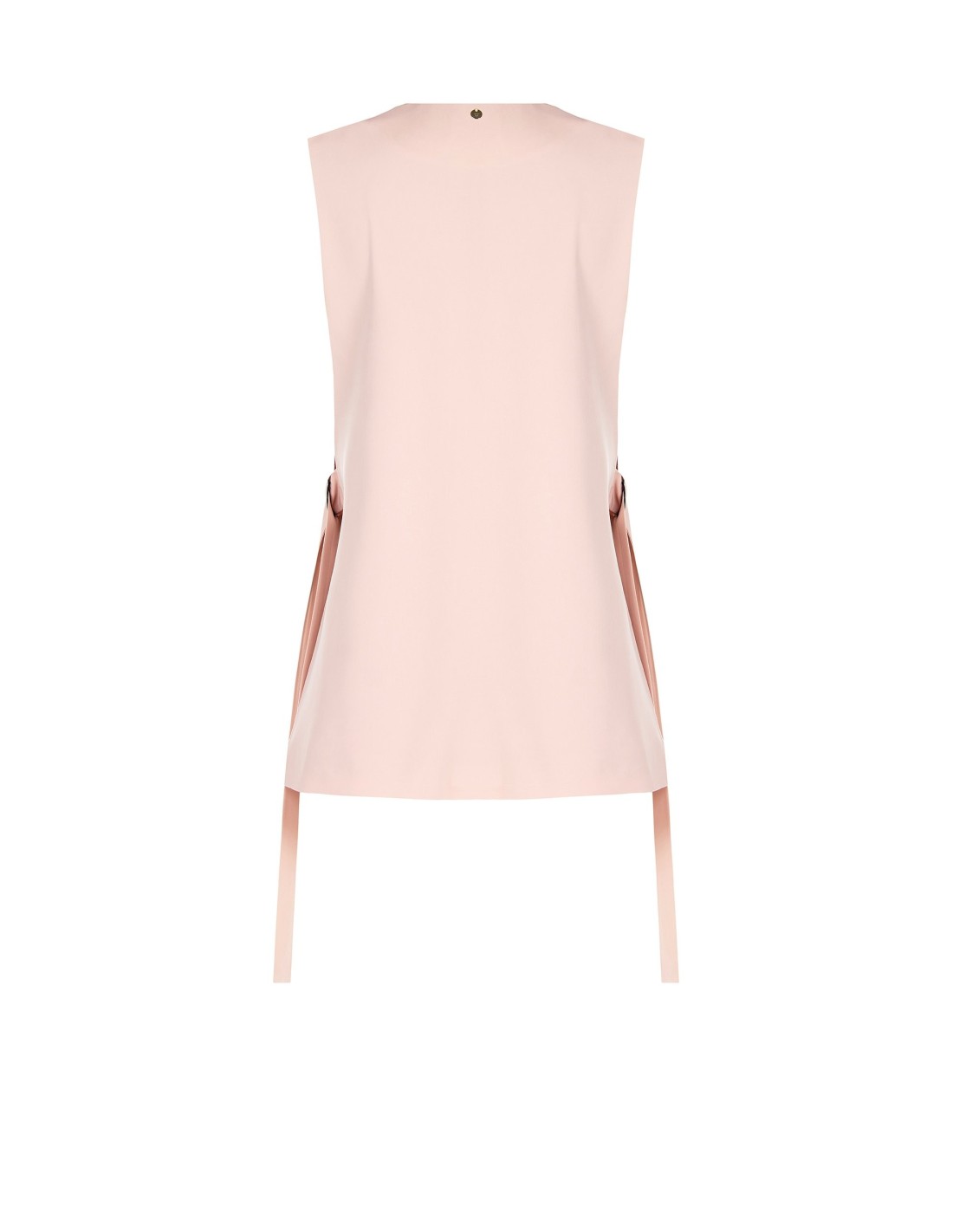 Blazer sem mangas com corte fluido e alongado, em tecido compacto com toque liso que acompanha a silhueta com conforto. O decote profundo e as cintas laterais com argolas definem a cintura com versatilidade. Perfeito para o escritório, o aperitivo e looks do dia a dia cuidados.