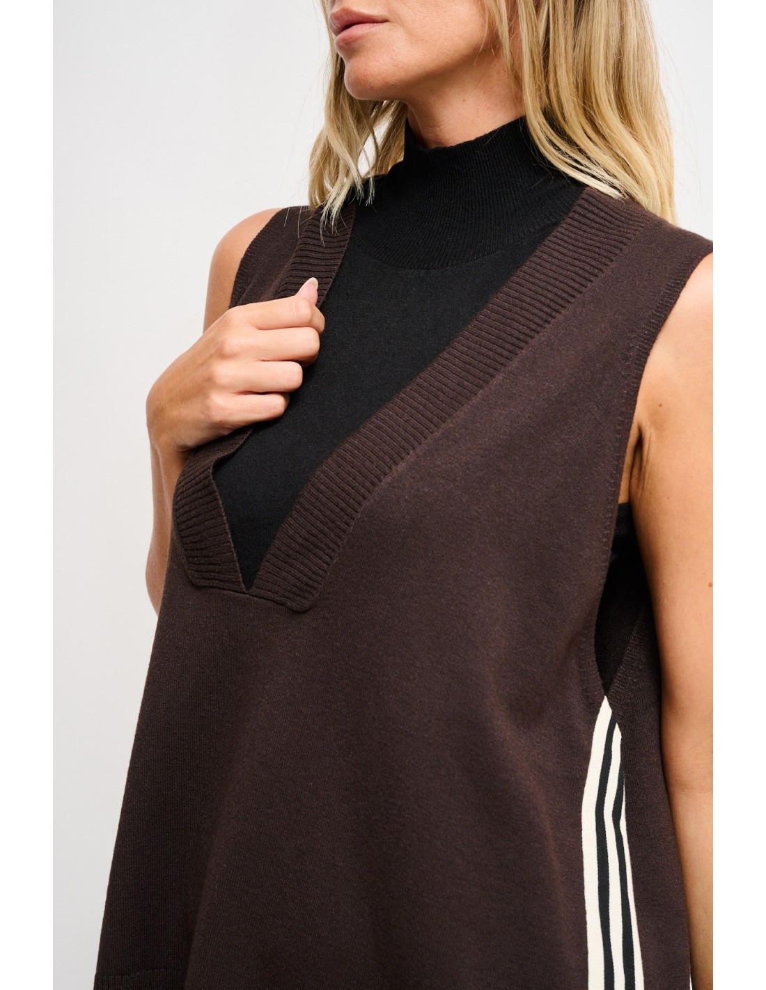 Maryley interpreta o tricot com um top sem mangas de corte suave e fluido, em malha macia com toque compacto. Gola alta envolvente, painéis laterais às riscas com pequenas aberturas para maior liberdade de movimento. Versátil: perfeito com denim ou joggers para o escritório smart e o tempo livre elegante.