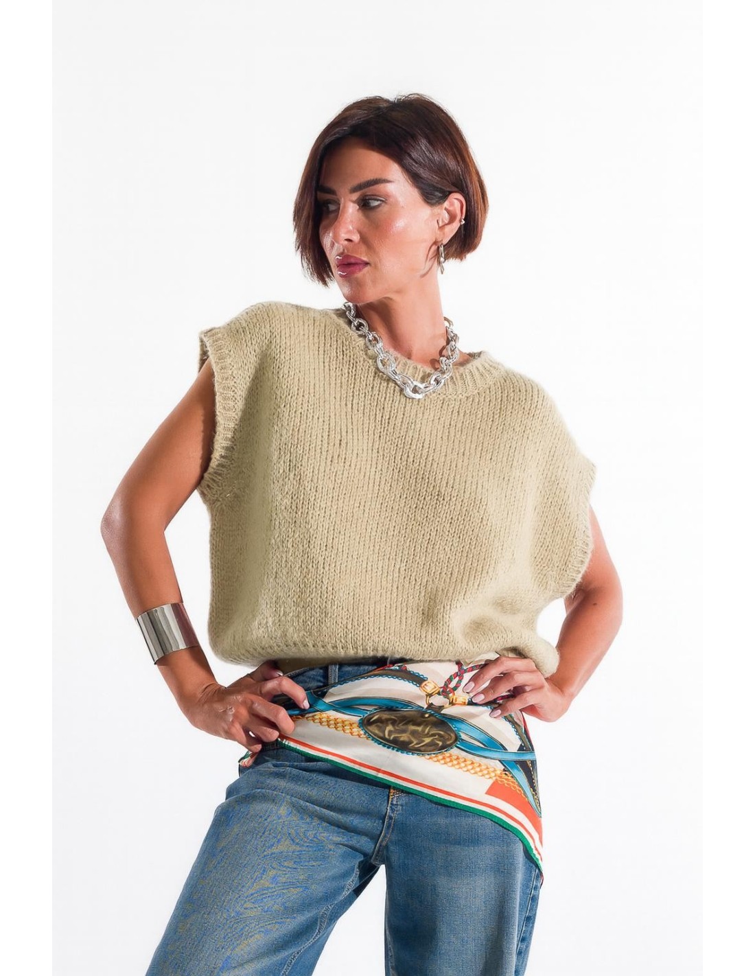 Konatto assina um top sem mangas de corte solto e ligeiramente boxy, em malha macia com efeito peluche e toque envolvente. Gola redonda em canelado e ombros caídos conferem uma silhueta descontraída mas cuidada. Fácil de sobrepor a camisas ou vestidos: perfeito para o escritório e para o dia a dia com um toque contemporâneo.