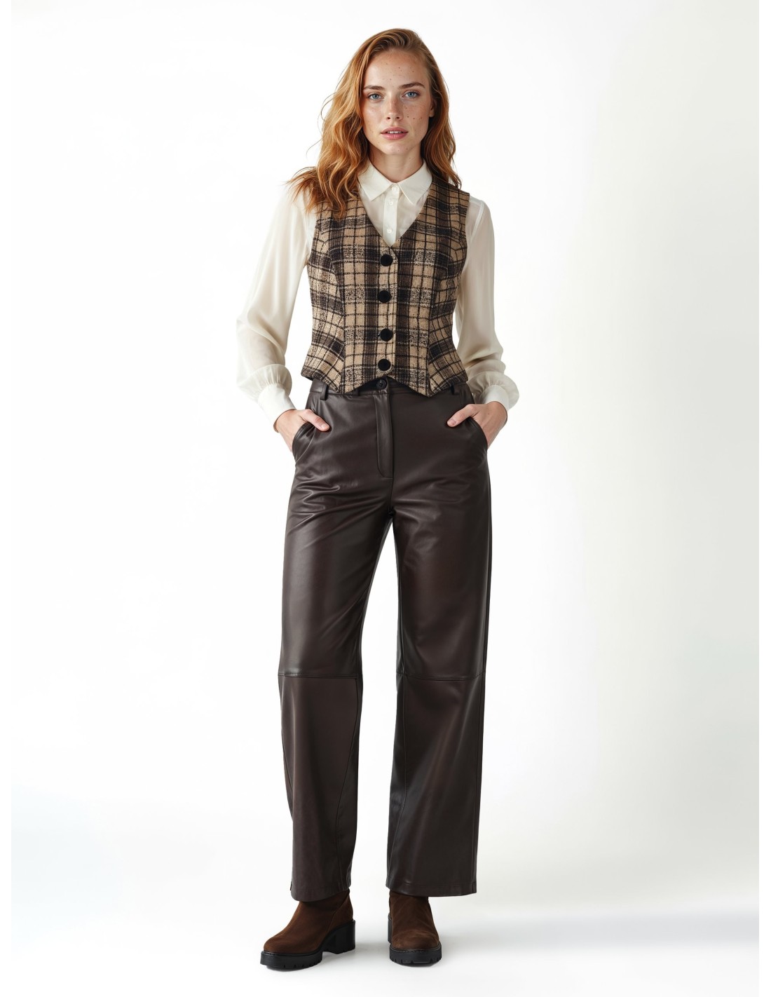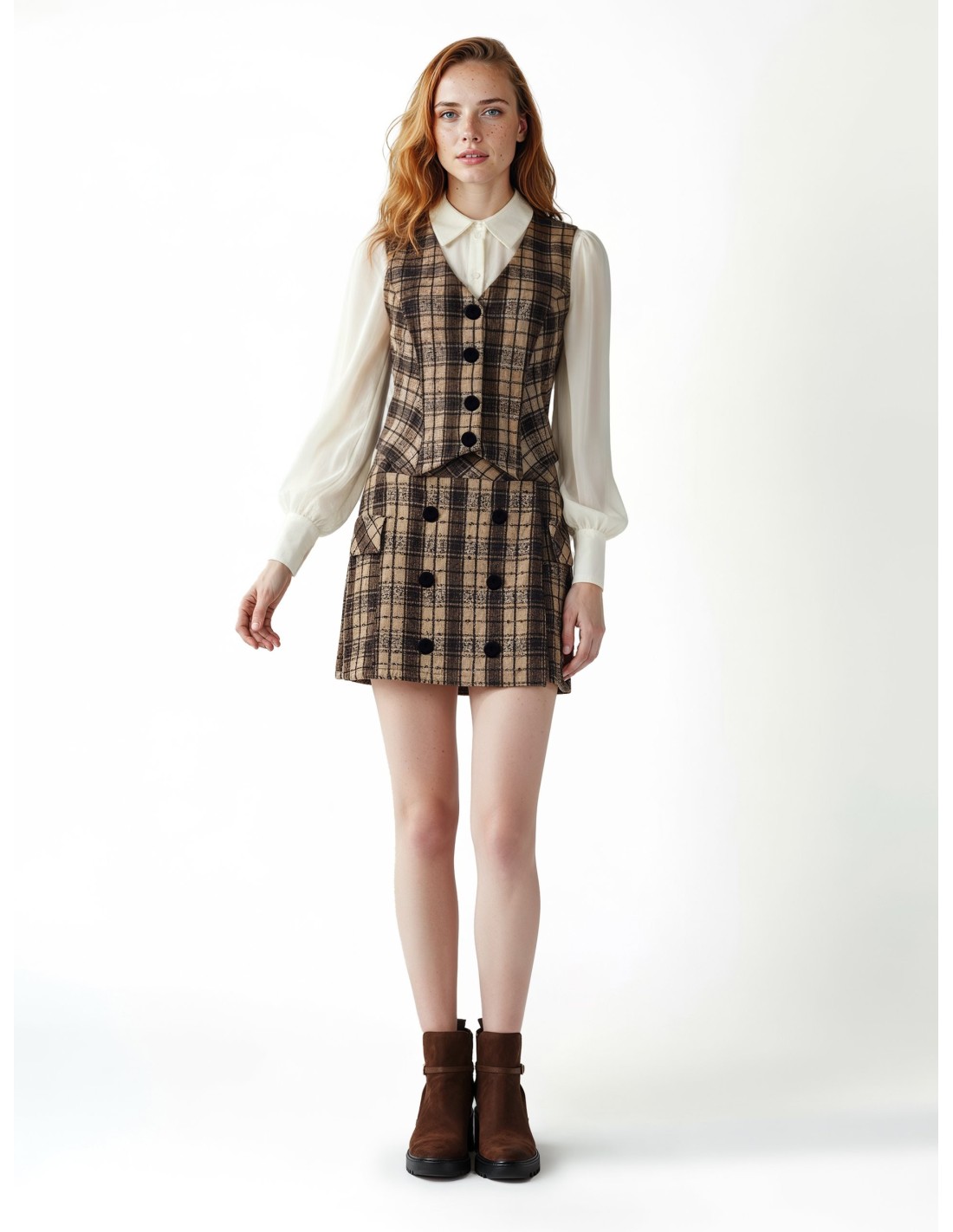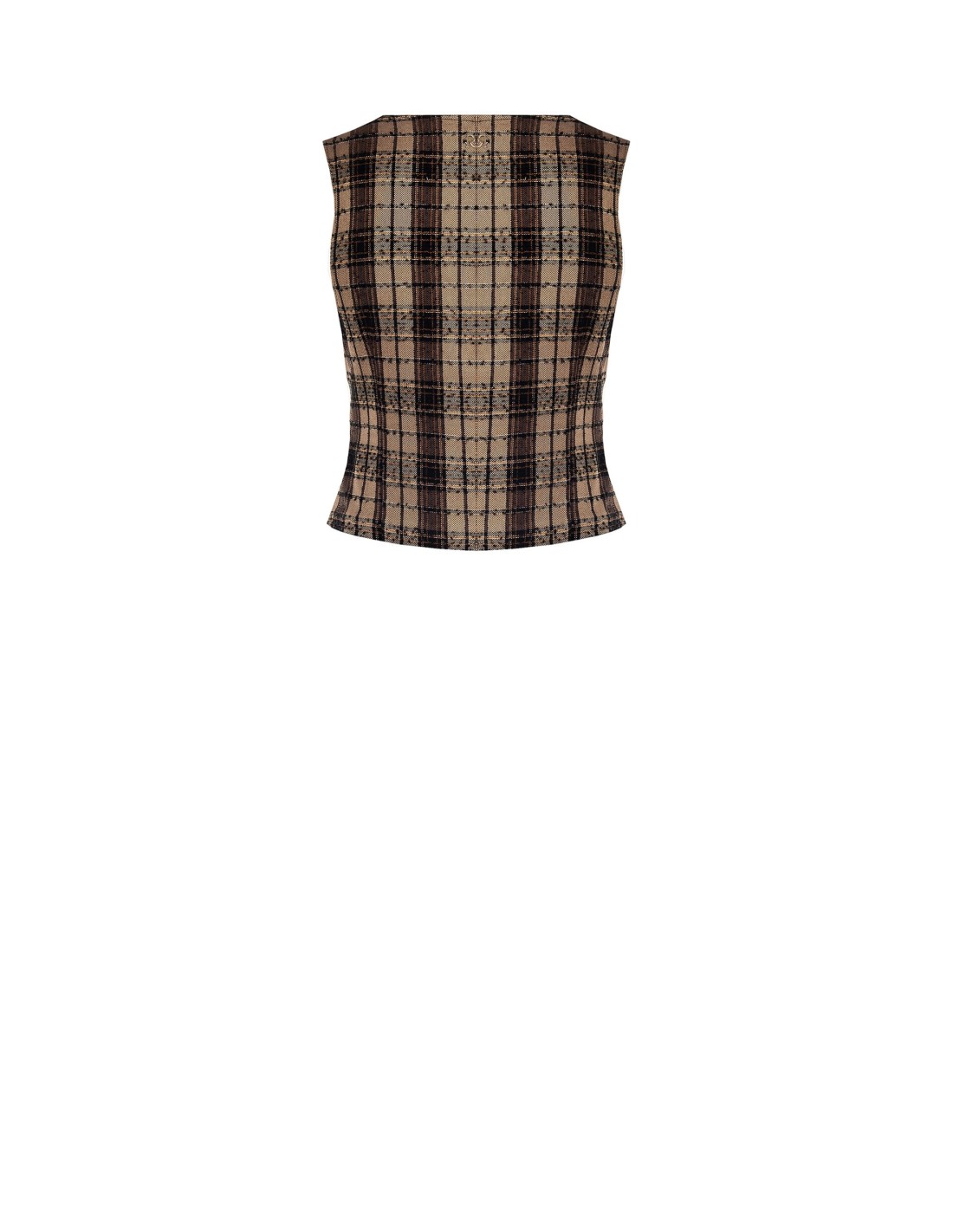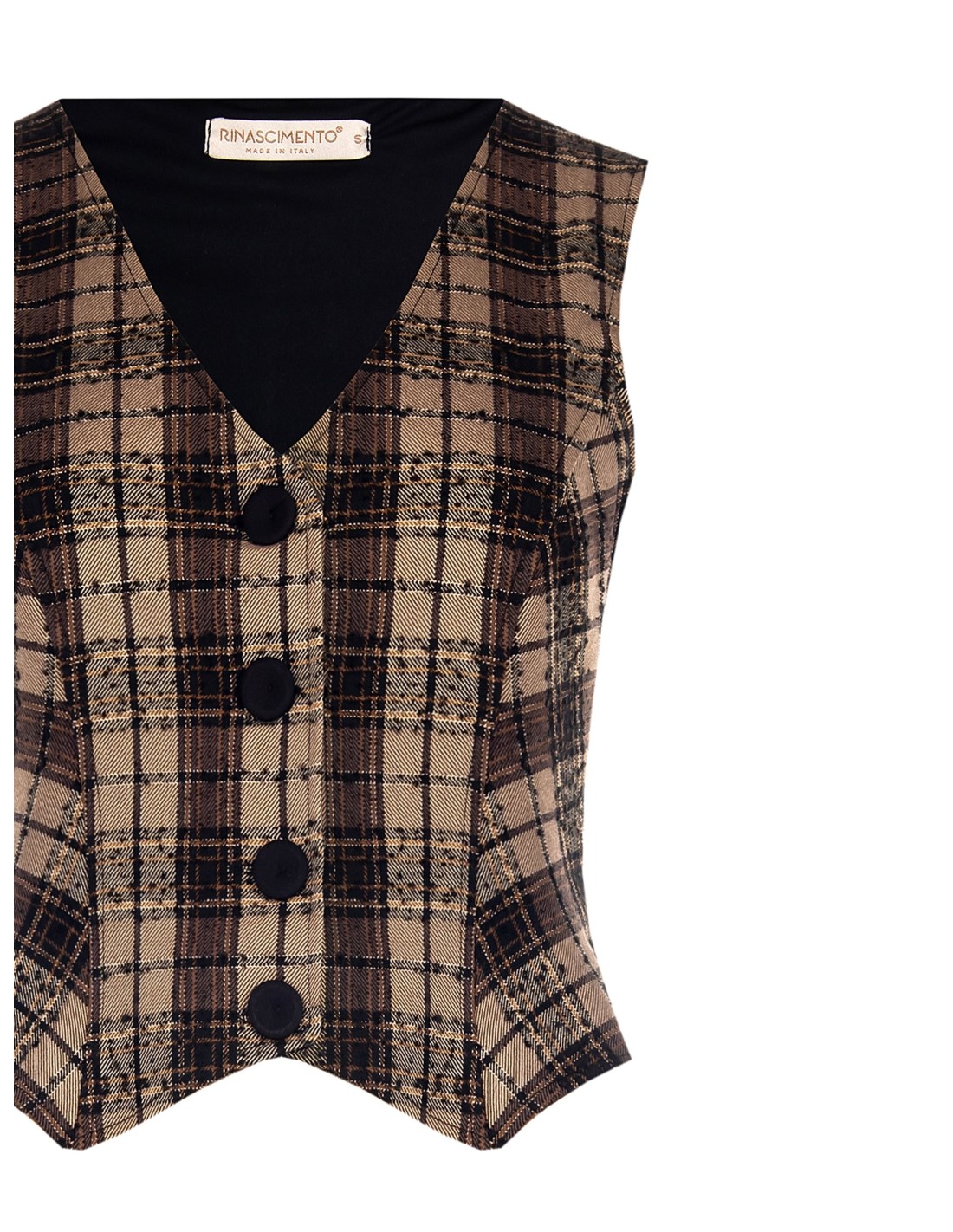Colete sartorial com um corte justo que define a cintura. Tecido xadrez com toque macio e compacto. Decote em V profundo e fecho com maxi botões forrados; barra em bico para alongar a silhueta. Perfeito com camisa para o escritório ou com denim e botas para o dia a dia. Rinascimento.