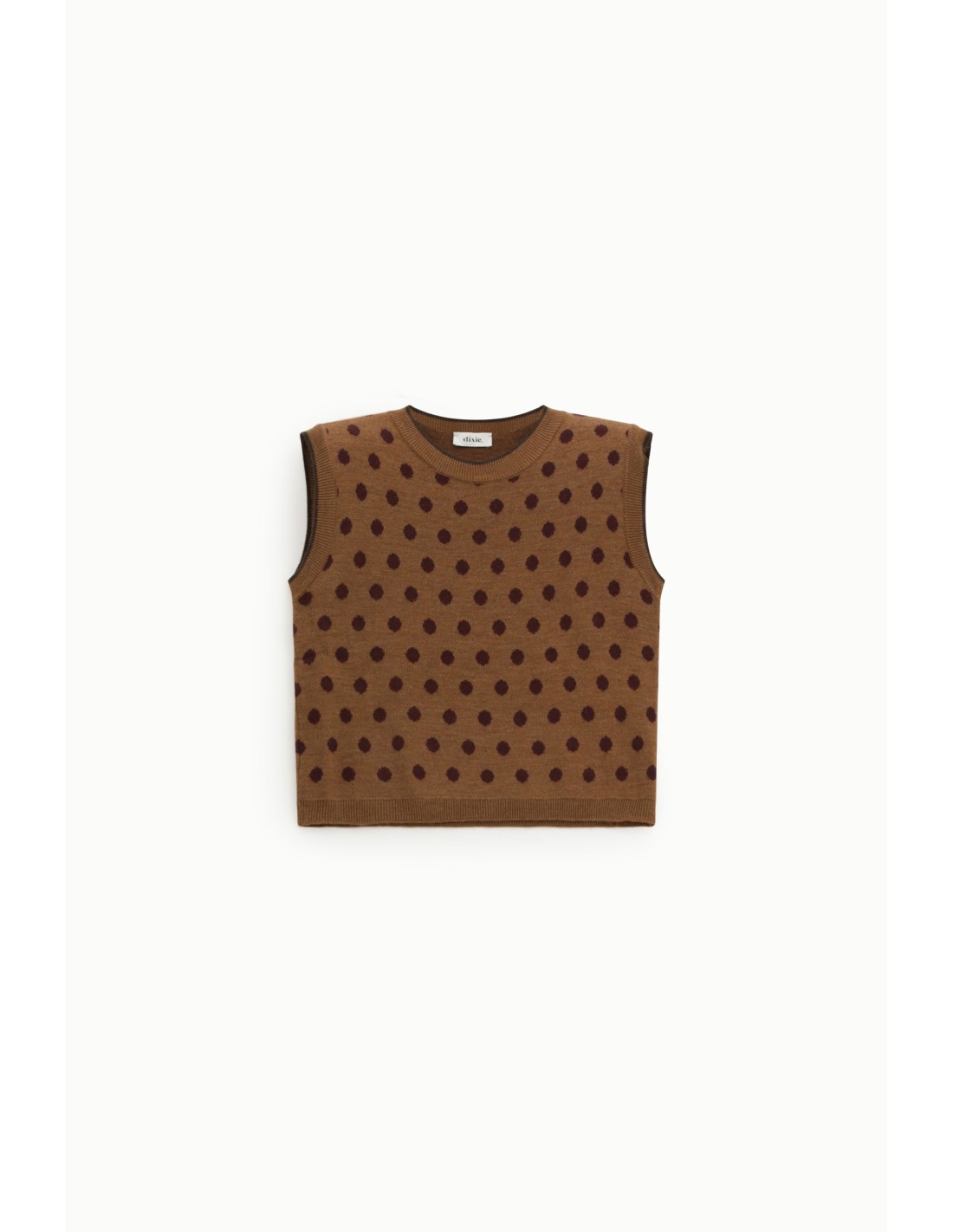 Um colete sem mangas que se destaca graças ao padrão de bolinhas em toda a superfície, com contornos de cores contrastantes no decote e nas cavas. Perfeito para sobrepor a camisas ou t-shirts e dar um toque criativo e original ao seu look diário, garantindo liberdade de movimentos e estilo pessoal.