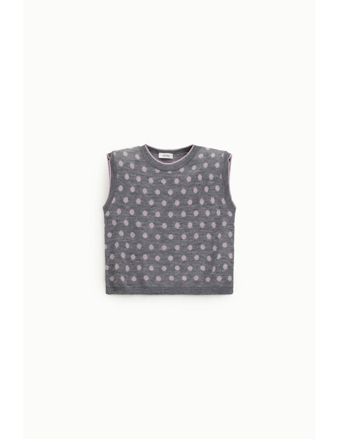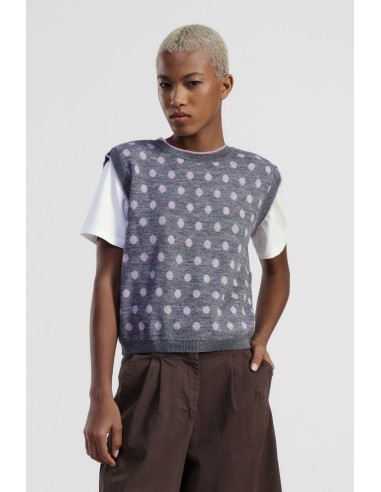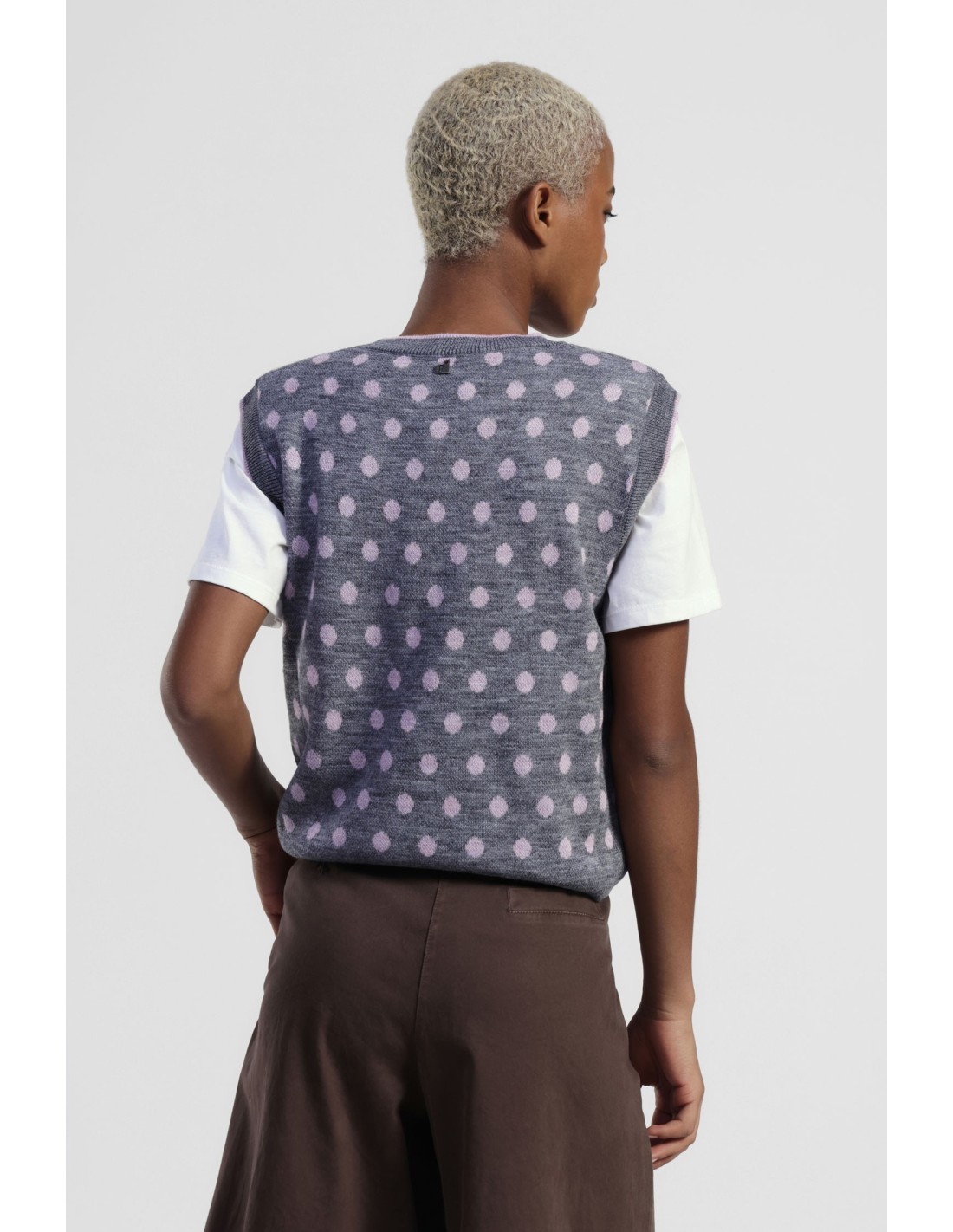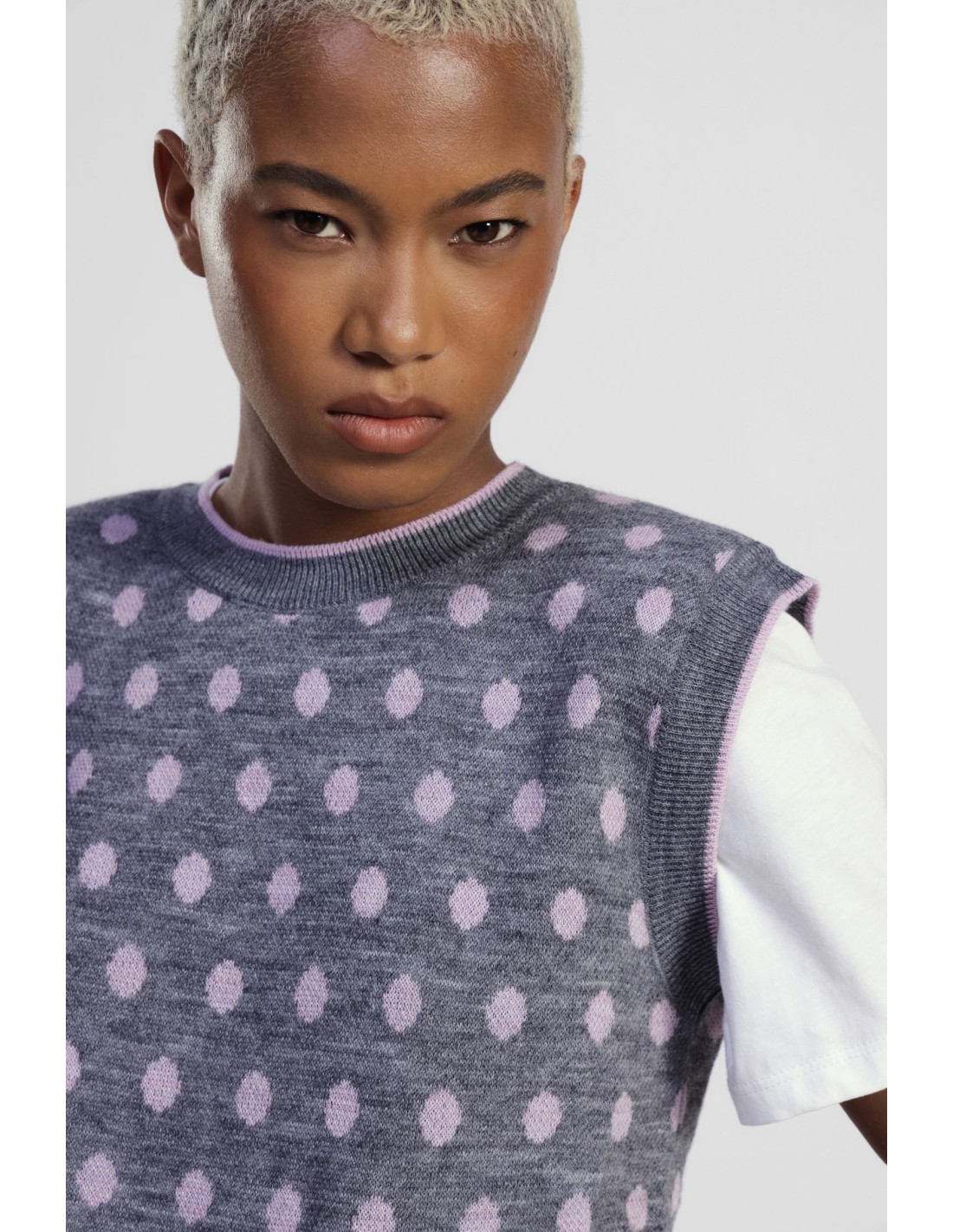 Um colete sem mangas que se destaca graças ao padrão de bolinhas em toda a superfície, com contornos de cores contrastantes no decote e nas cavas. Perfeito para sobrepor a camisas ou t-shirts e dar um toque criativo e original ao seu look diário, garantindo liberdade de movimentos e estilo pessoal.