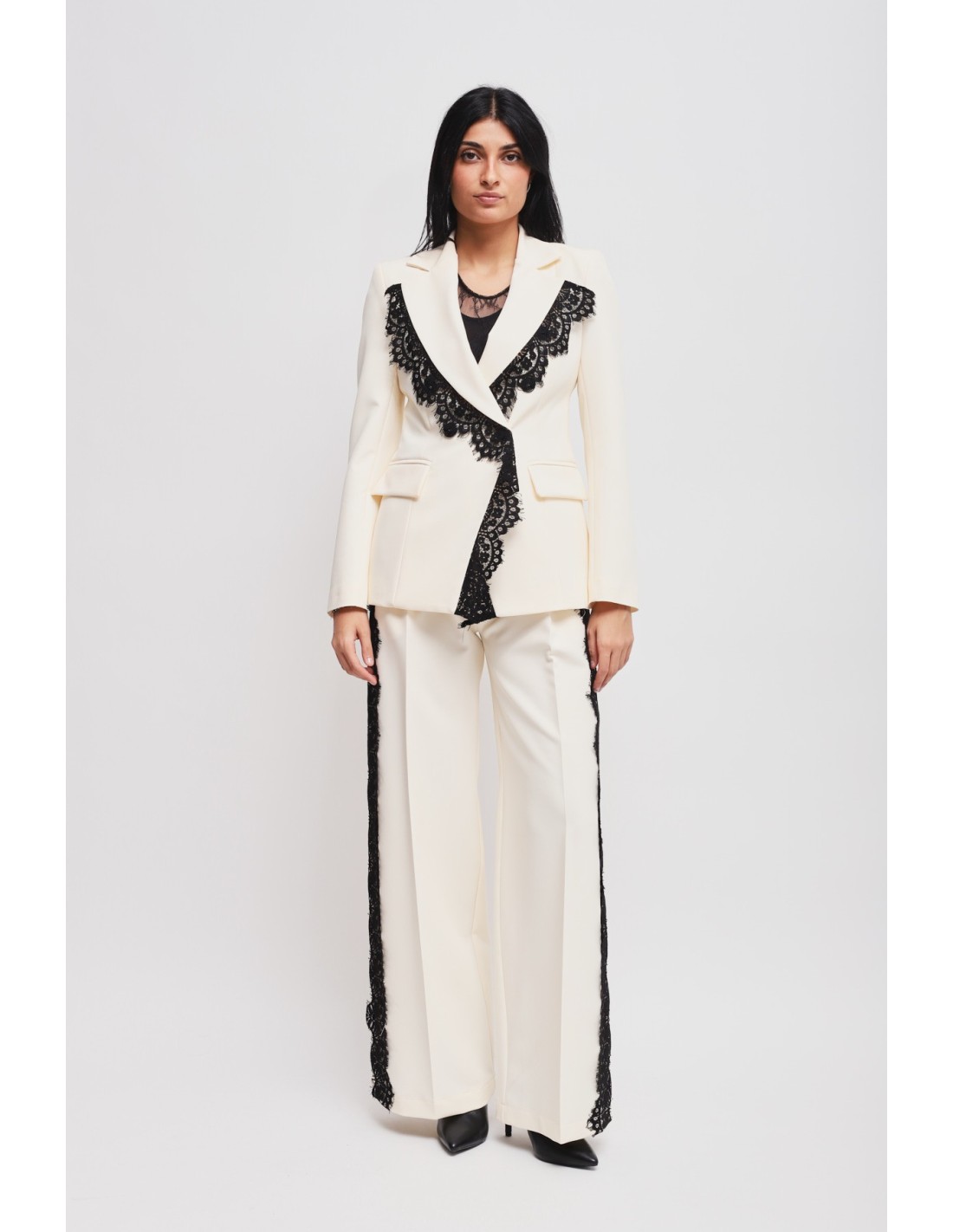 Conjunto blazer de duplo peito e calças palazzo com renda Maryley