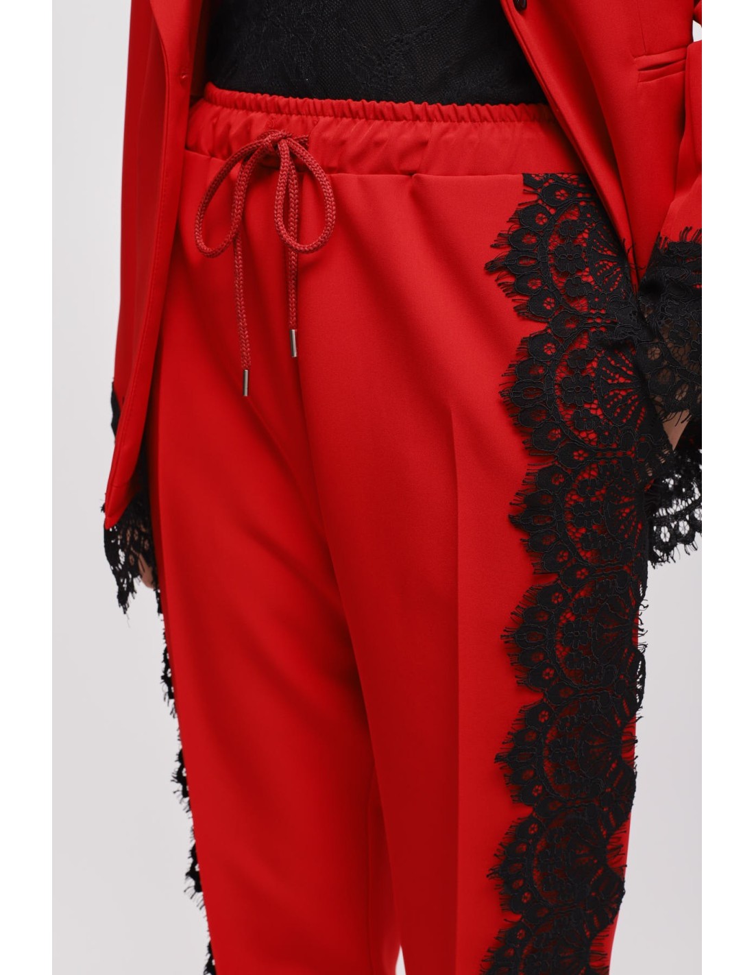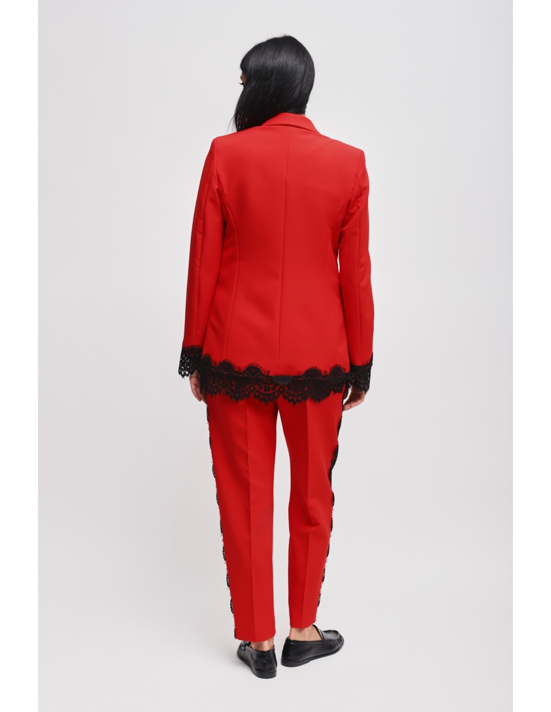 Este conjunto oferece uma elegância refinada com um toque ousado. O blazer de corte simples e as calças cigarrete são acabados com amplas inserções em renda preta nas bainhas e laterais. Ideal para quem procura um outfit distintivo, sofisticado e impecável para cada ocasião importante.