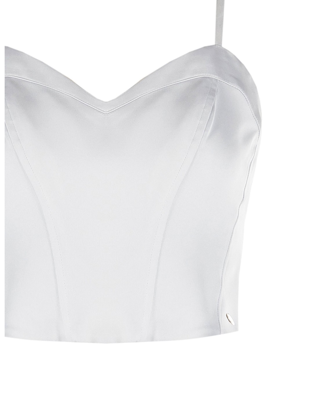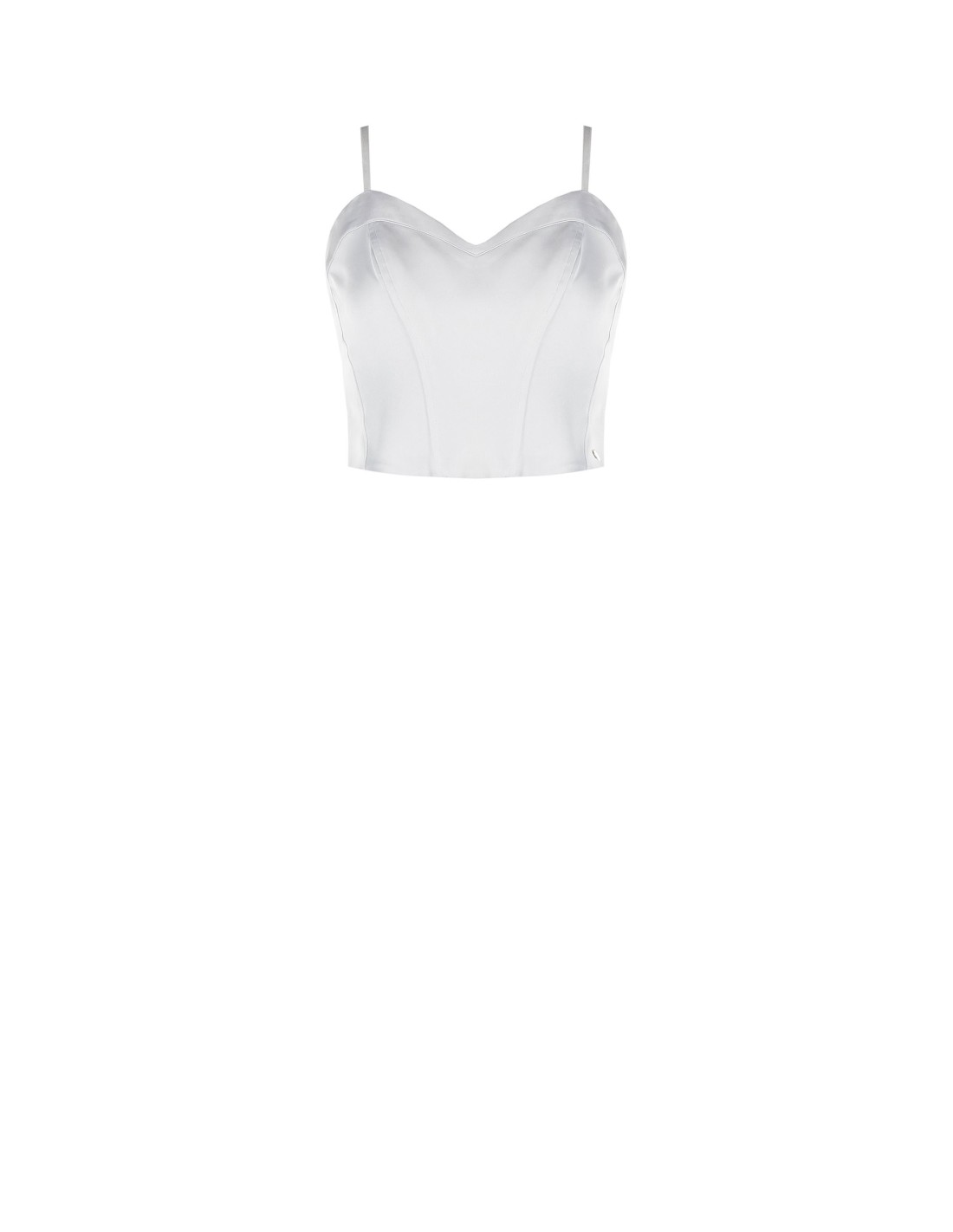 Top curto de corte justo que esculpe a silhueta com barbatanas leves. Cetim fluido e ligeiramente brilhante para um conforto agradável na pele. Decote coração e alças finas ajustáveis, fecho de correr traseiro para vestir com facilidade. Perfeito para festas e jantares, para combinar com blazer ou cintura alta para um look elegante.