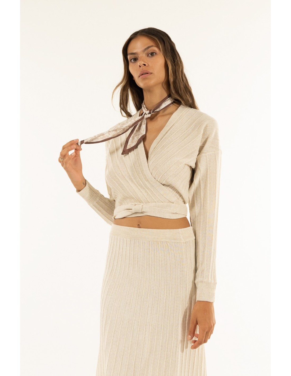 Camisola justa mas confortável Kontatto em malha fina e suavemente canelada que valoriza a silhueta. Decote em V com decote cruzado e nó lateral ajustável, mangas compridas e bainha curta para um efeito feminino. Ideal para combinar com uma saia ou uma calça de ganga para um estilo elegante no escritório ou no dia a dia.
