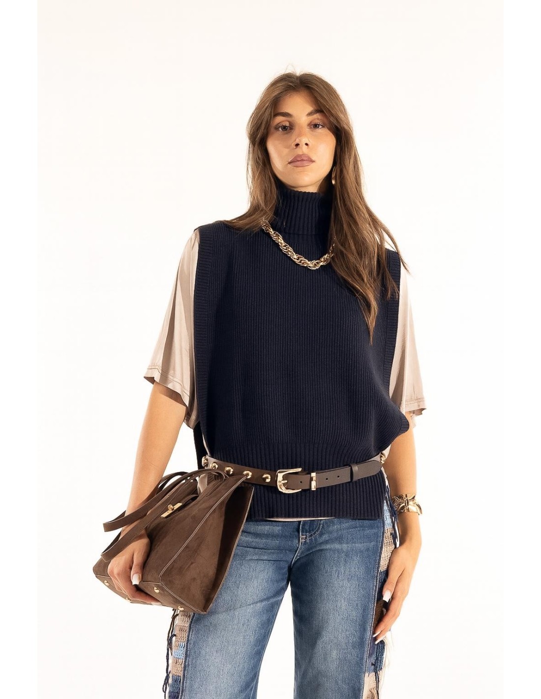 Kontatto assina um top sem mangas com gola alta, corte suave e boxy que valoriza a silhueta em camadas. Malha em canelado inglês em fio macio, agradável na pele. Ombros caídos e barra em canelado para definir a linha. Versátil do escritório ao dia a dia, perfeito sobre camisas ou vestidos.