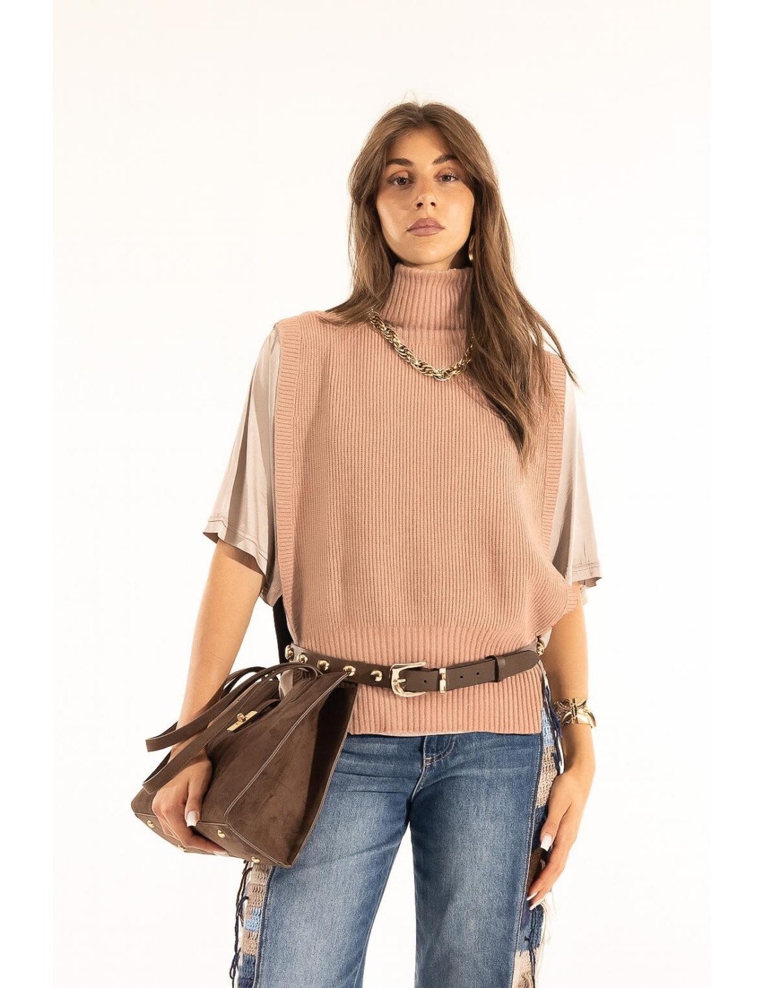 Kontatto assina um top sem mangas com gola alta, corte suave e boxy que valoriza a silhueta em camadas. Malha em canelado inglês em fio macio, agradável na pele. Ombros caídos e barra em canelado para definir a linha. Versátil do escritório ao dia a dia, perfeito sobre camisas ou vestidos.