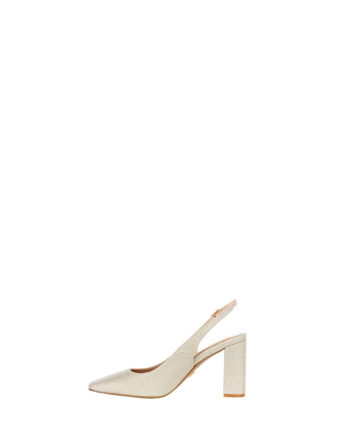 Sapato de salto com fit feminino e estável, pensado para alongar a silhueta com conforto. A textura luminosa com efeito glitter encontra a biqueira quadrada e o tirante traseiro com fivela regulável. Perfeito para festas, cerimónias ou para dar carácter aos looks de escritório.
