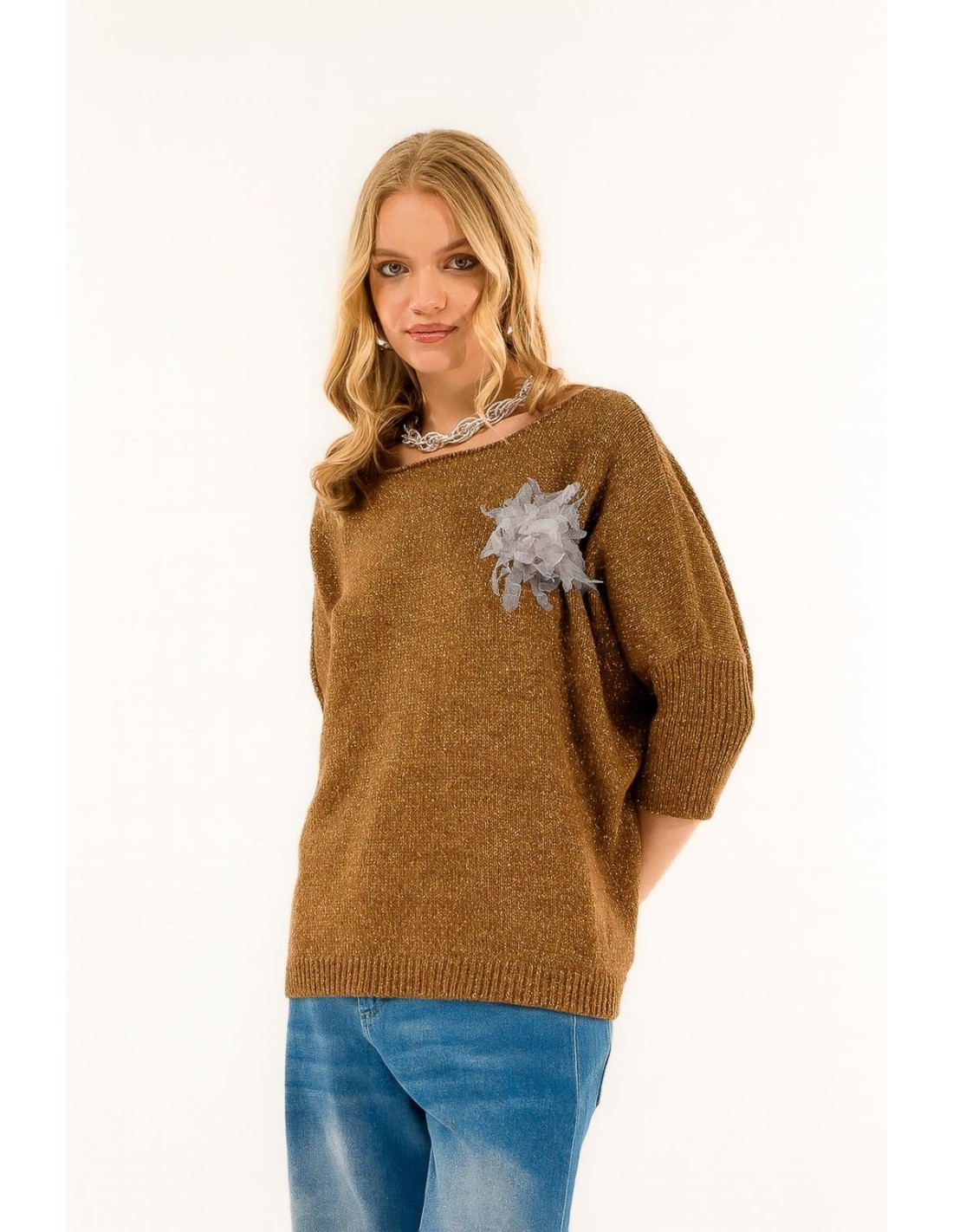Jersey Kontatto com um ajuste suave e solto, confortável nos ombros. Tricot com fio ligeiramente brilhante para uma textura suave e refinada. Detalhes: folgado, com mangas a três quartos e pregadeira floral amovível no peito. Versátil do escritório ao aperitivo, realça a silhueta sem apertar.