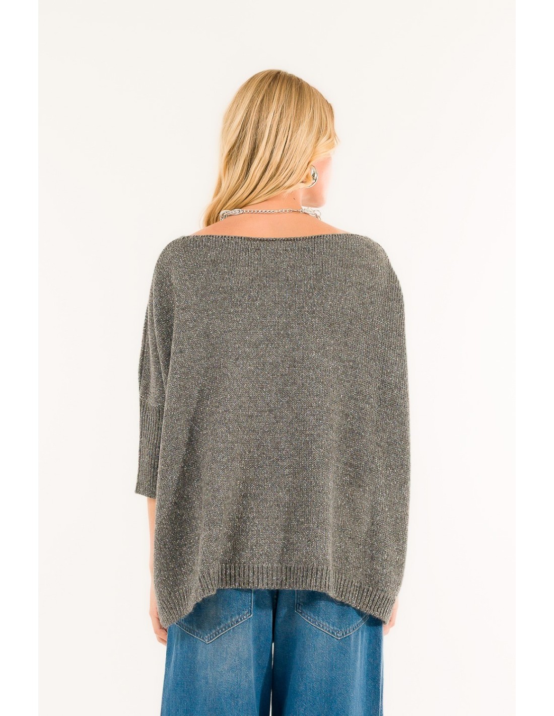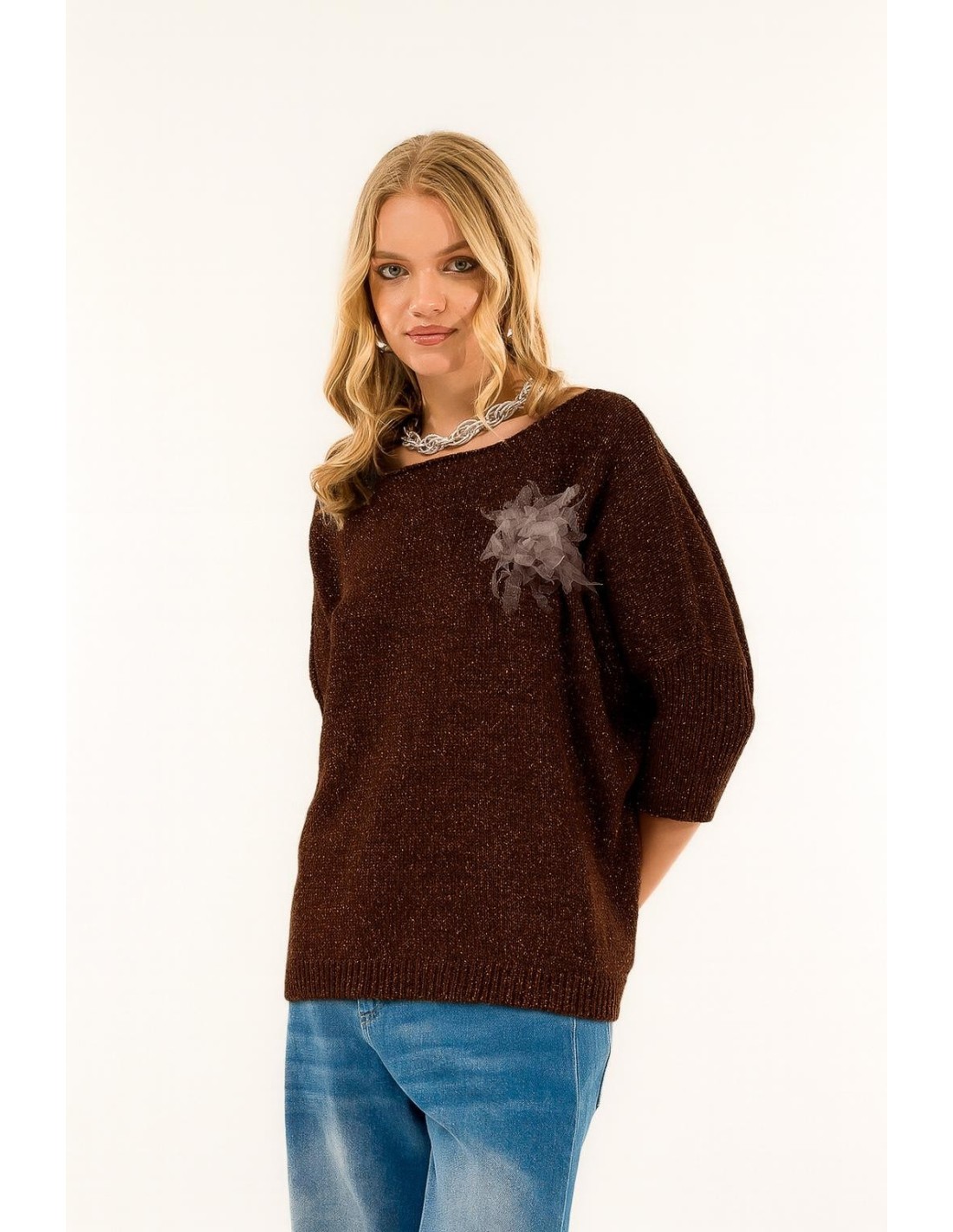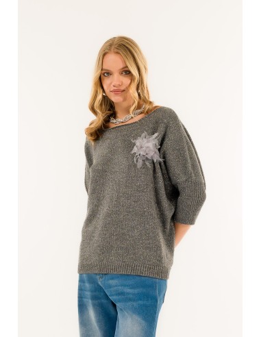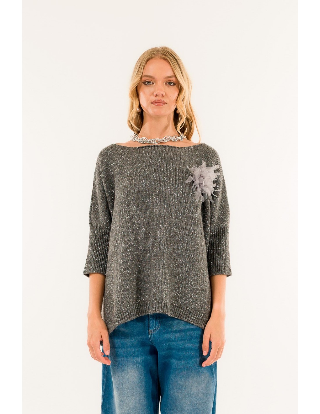 Jersey Kontatto com um ajuste suave e solto, confortável nos ombros. Tricot com fio ligeiramente brilhante para uma textura suave e refinada. Detalhes: folgado, com mangas a três quartos e pregadeira floral amovível no peito. Versátil do escritório ao aperitivo, realça a silhueta sem apertar.