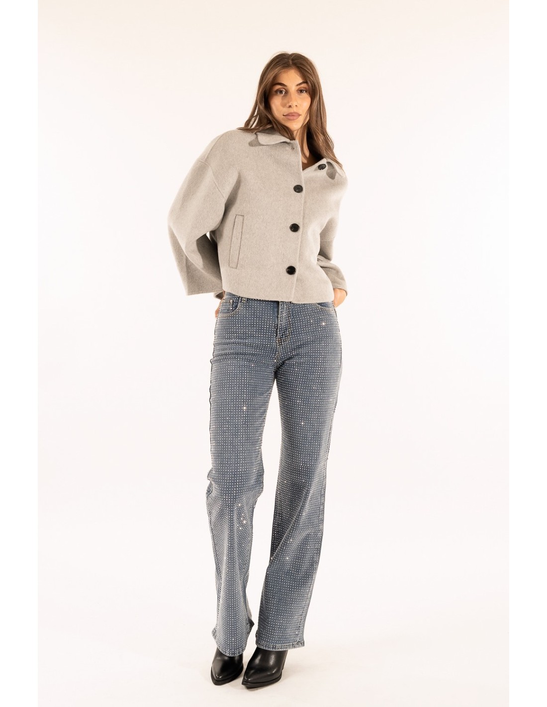 Kontatto assina uns jeans de perna evasê com corte suave na coxa e um caimento final que alonga a silhueta. Denim confortável com micro aplicações luminosas por todo o tecido. Cintura média, clássico five-pocket e fecho com zip e botão. Perfeito para festas e soirées, fácil de elevar também no quotidiano com um blazer.