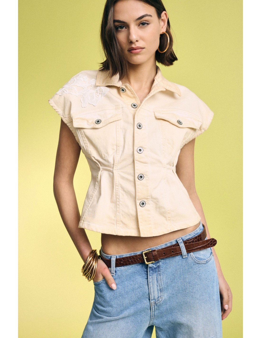 Casaco curto de ganga com ombros largos e detalhes bordados