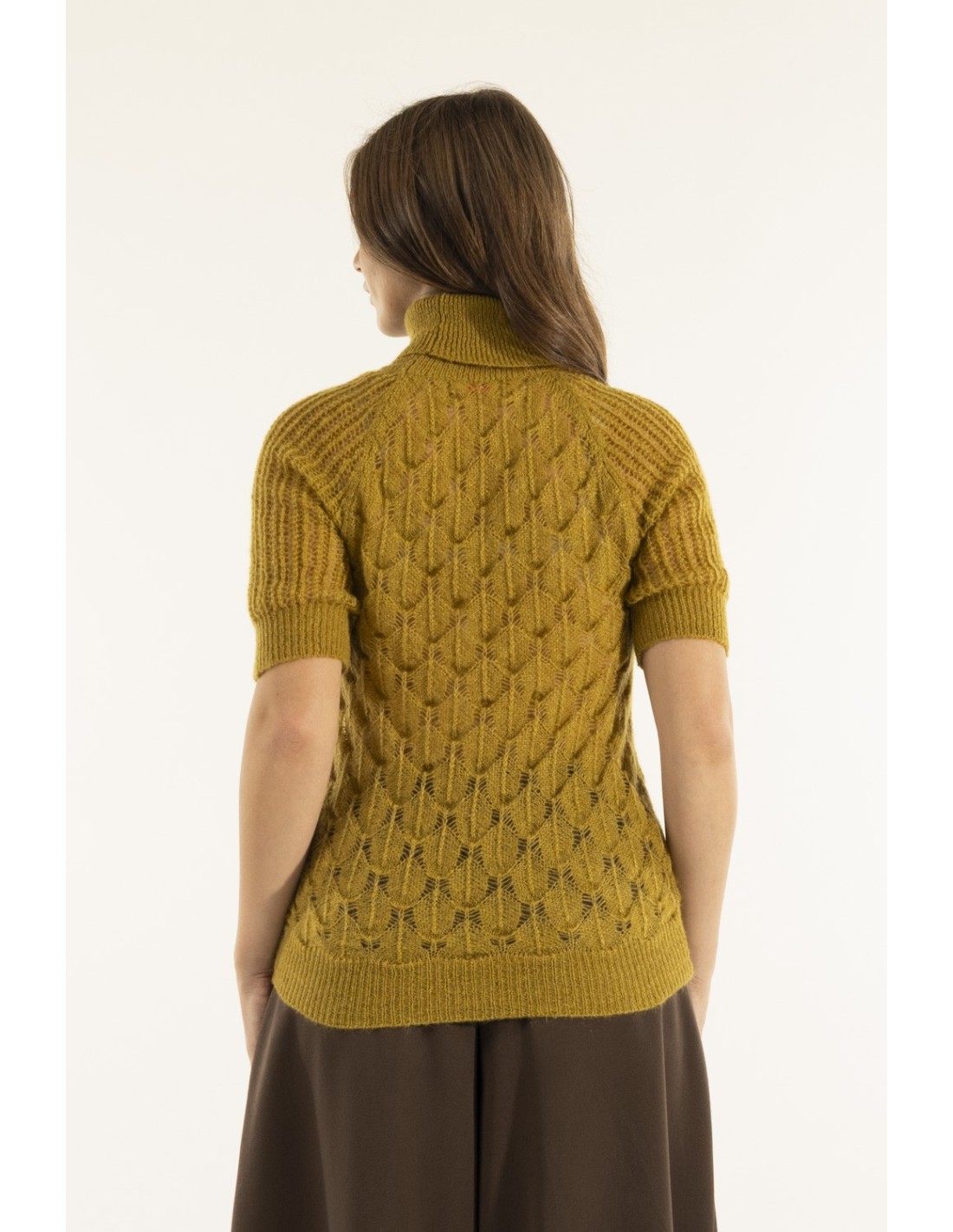 Camisola de gola alta assinada Kontatto, corte com caimento suave que valoriza sem marcar. Malha trabalhada com pontos vazados em relevo em fio macio com toque leve e confortável. Gola envolvente e mangas curtas com punho canelado para um toque moderno. Perfeita com calças de alfaiataria no escritório ou com denim para o dia a dia.