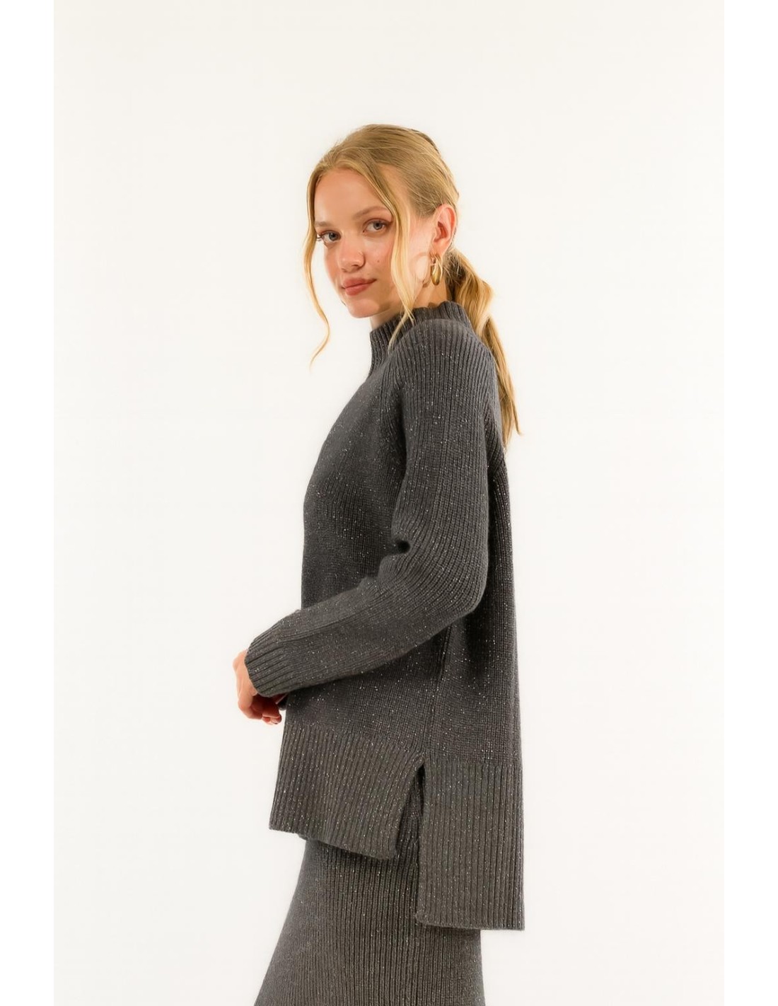 Camisola suave e descontraída que valoriza a silhueta sem a apertar. Tricot macio com fio ligeiramente brilhante, agradável à pele. Gola alta estruturada, fendas laterais largas e bainha canelada para movimento e cobertura. Perfeito para o escritório com calças, mas também ideal para o dia a dia com calças de ganga ou uma saia.