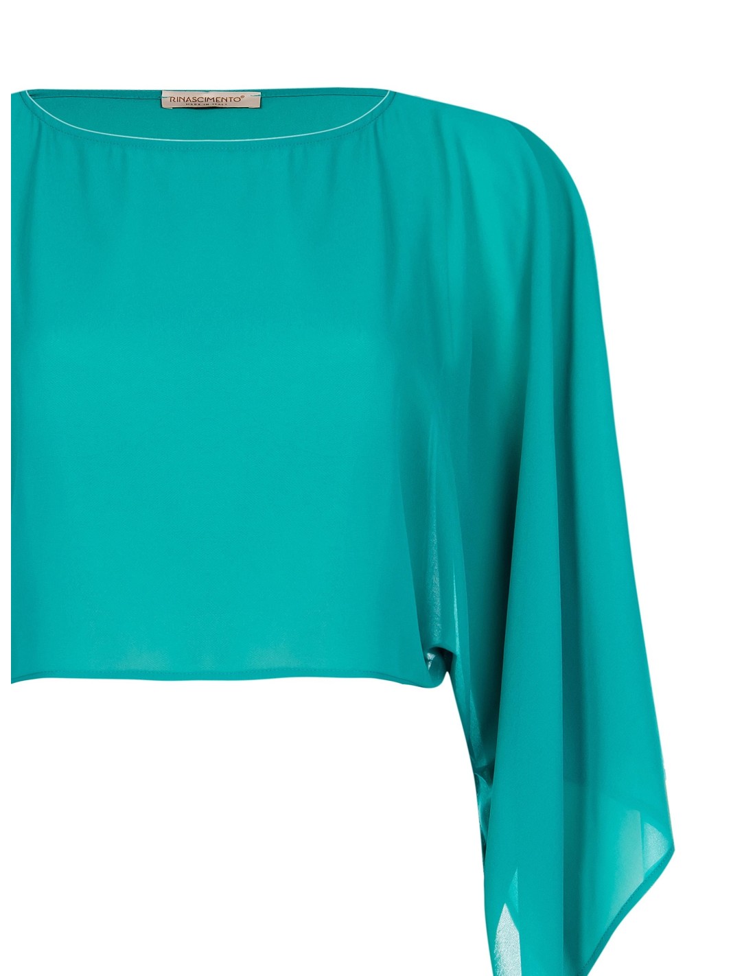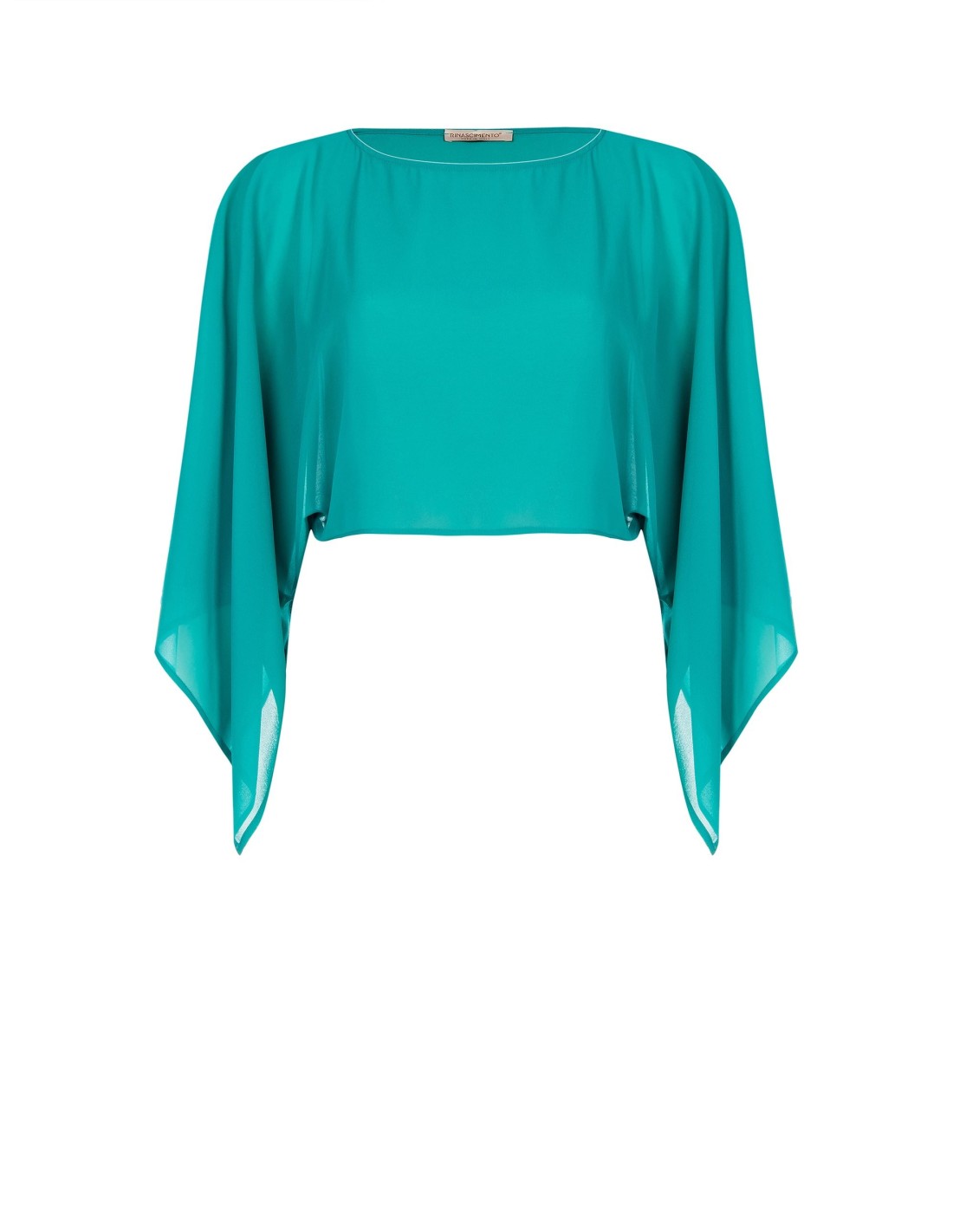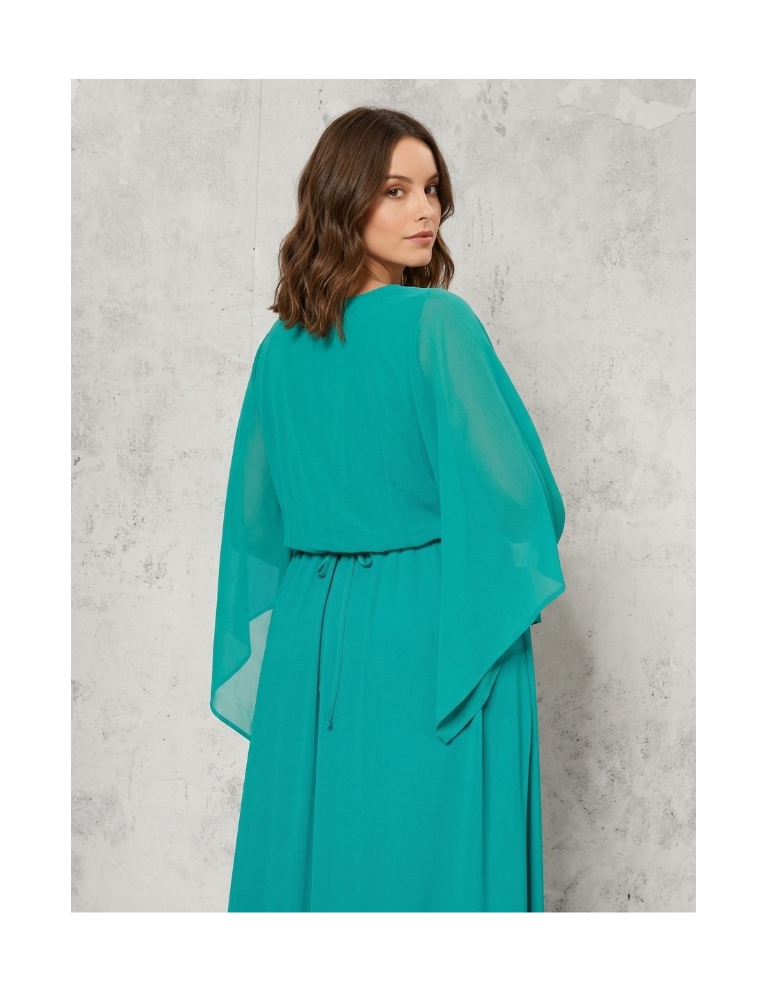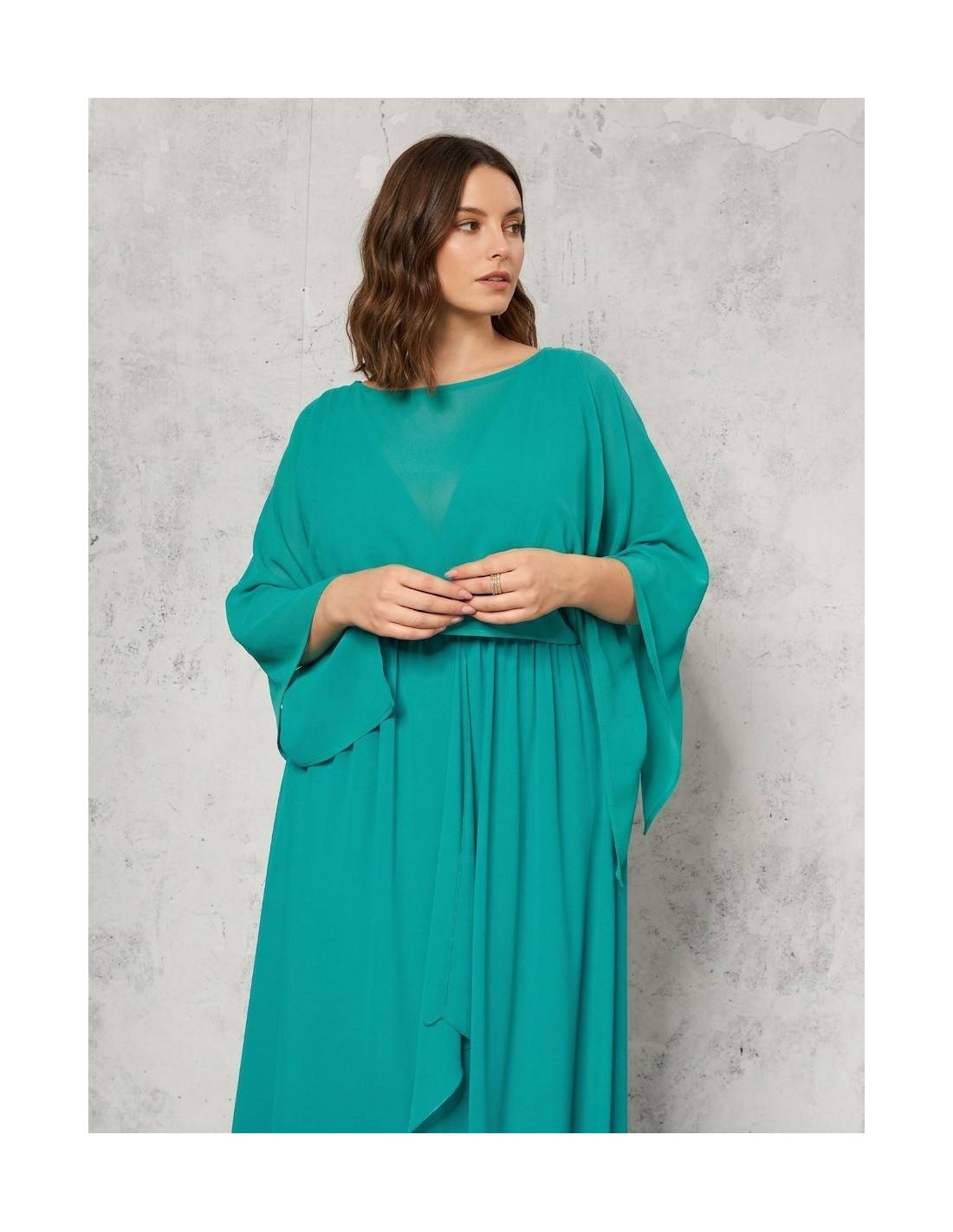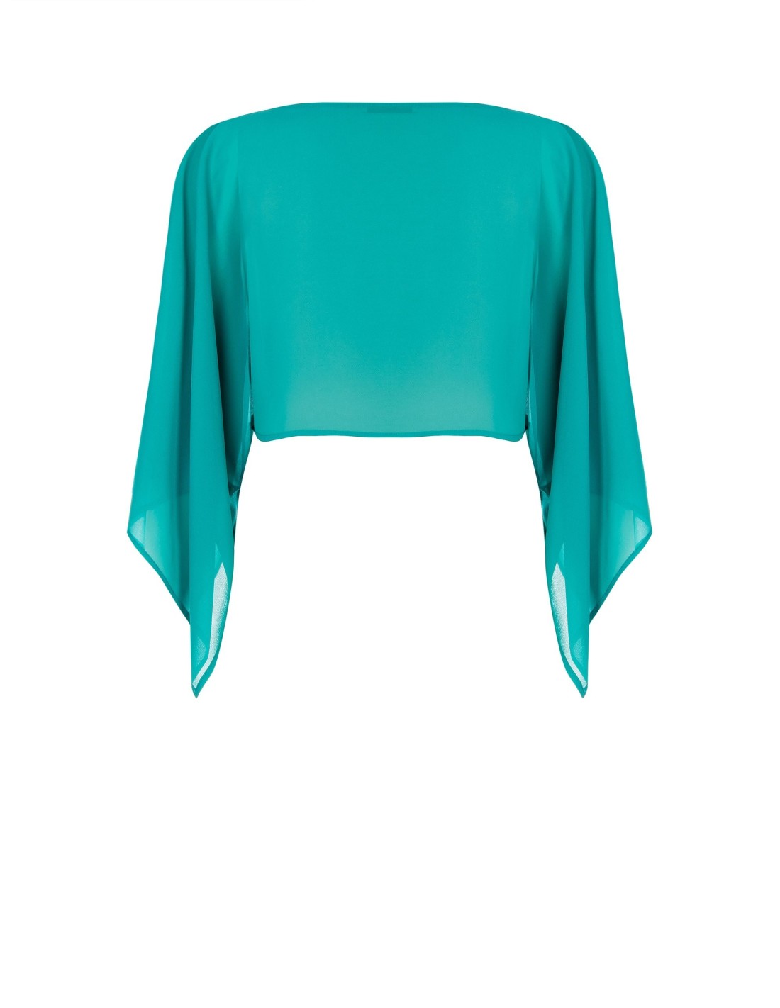 Capa para os ombros de corte fluido e ajuste suave, em georgette leve e semi-transparente que acaricia a silhueta com conforto. O decote amplo e as mangas tipo capa com pontas suaves acrescentam movimento. Perfeita sobre vestidos elegantes, para cerimónias, festas ou noites especiais.