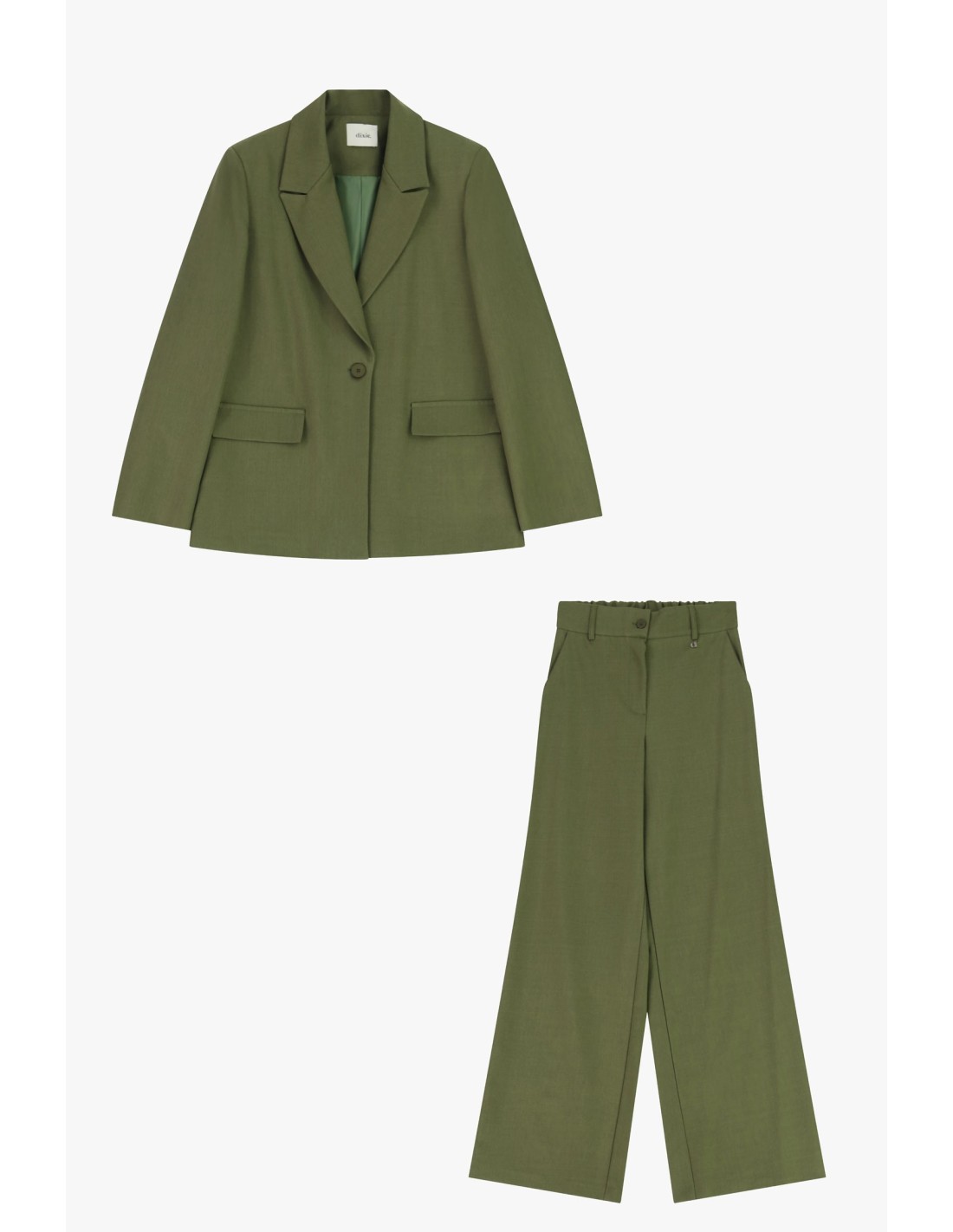 Descubra o charme de um fato versátil que alia conforto e estilo. O casaco com um só peito e bolsos confere praticidade, enquanto as calças de corte largo proporcionam liberdade de movimentos. Perfeito para qualquer ocasião, este fato destaca-se pelo seu carácter prático e pelo seu design requintado.
