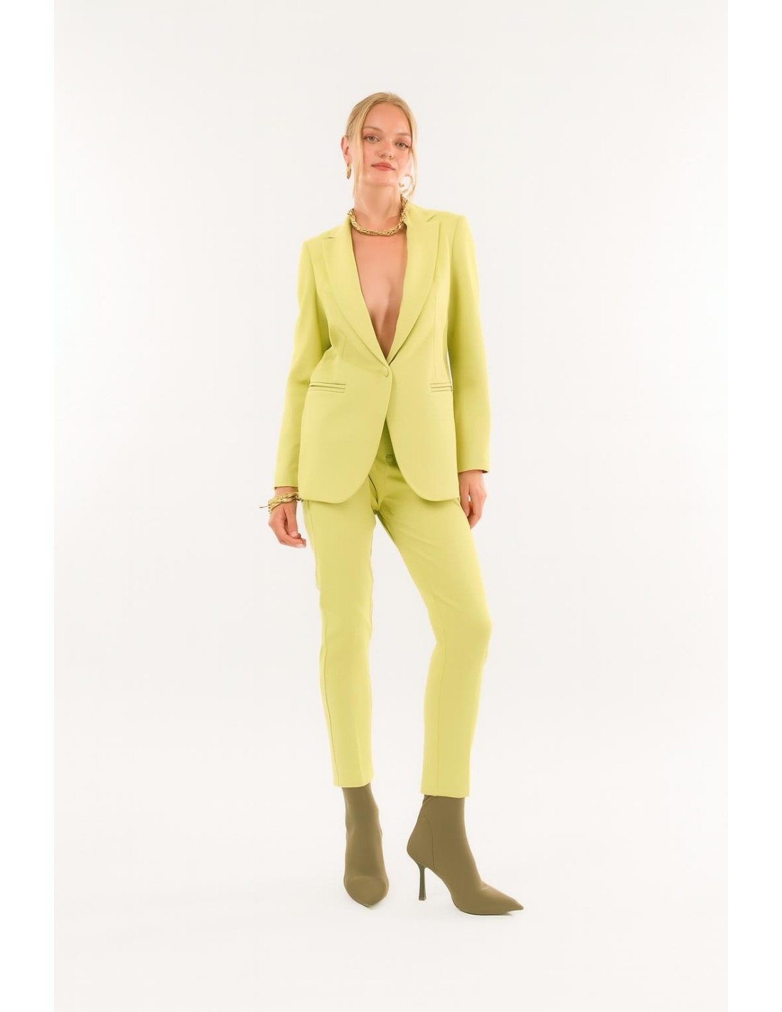 Linhas essenciais, uma silhueta cónica e detalhes sofisticados: este fato realça a feminilidade com uma elegância decidida e contemporânea. Perfeito para quem quer sentir-se impecável e confiante em todas as ocasiões.