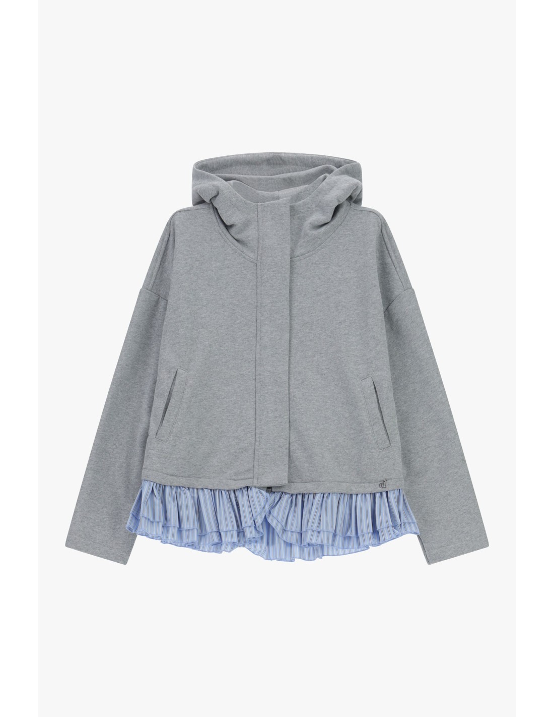 Perfeita para quem gosta de um estilo feminino mas prático, esta sweatshirt com capuz destaca-se graças ao folho plissado na bainha. Os bolsos laterais aumentam o conforto, enquanto o corte descontraído torna-a ideal para usar todos os dias, acrescentando um toque original até aos looks mais simples.