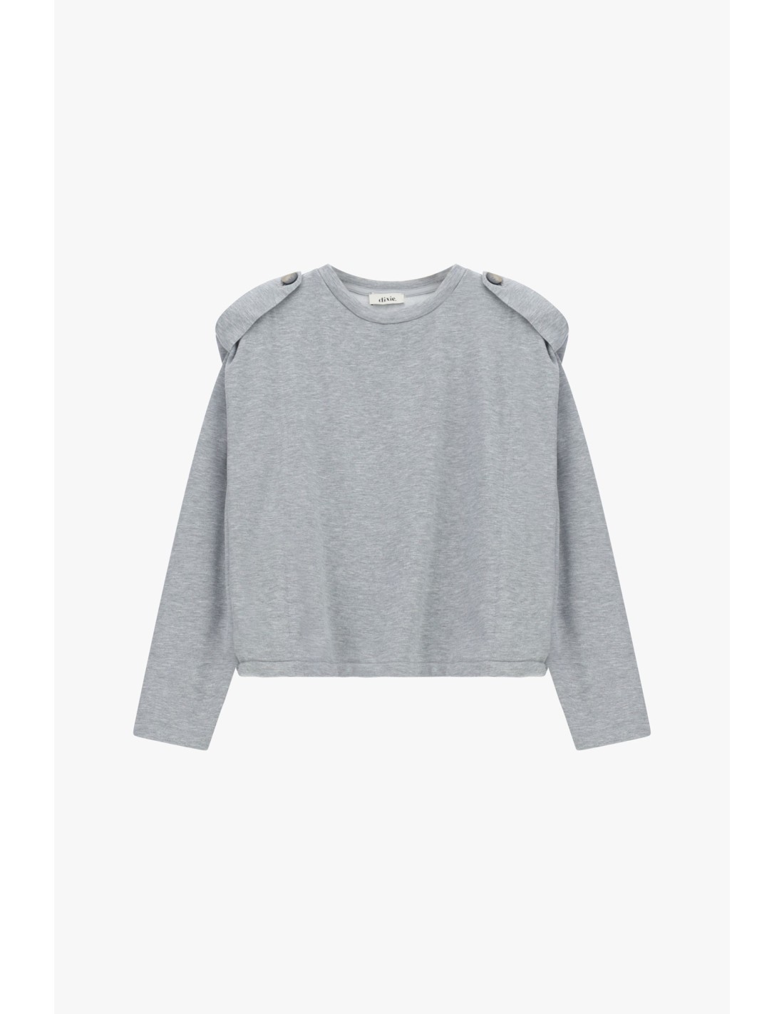 Uma sweatshirt essencial mas rica em carácter graças aos ombros estruturados com pormenor de pala e botões. A linha direita e o corte curto tornam-na perfeita para combinar com jeans ou saias de cintura alta, para um look distintivo todos os dias. O decote redondo proporciona conforto e praticidade em qualquer ocasião.