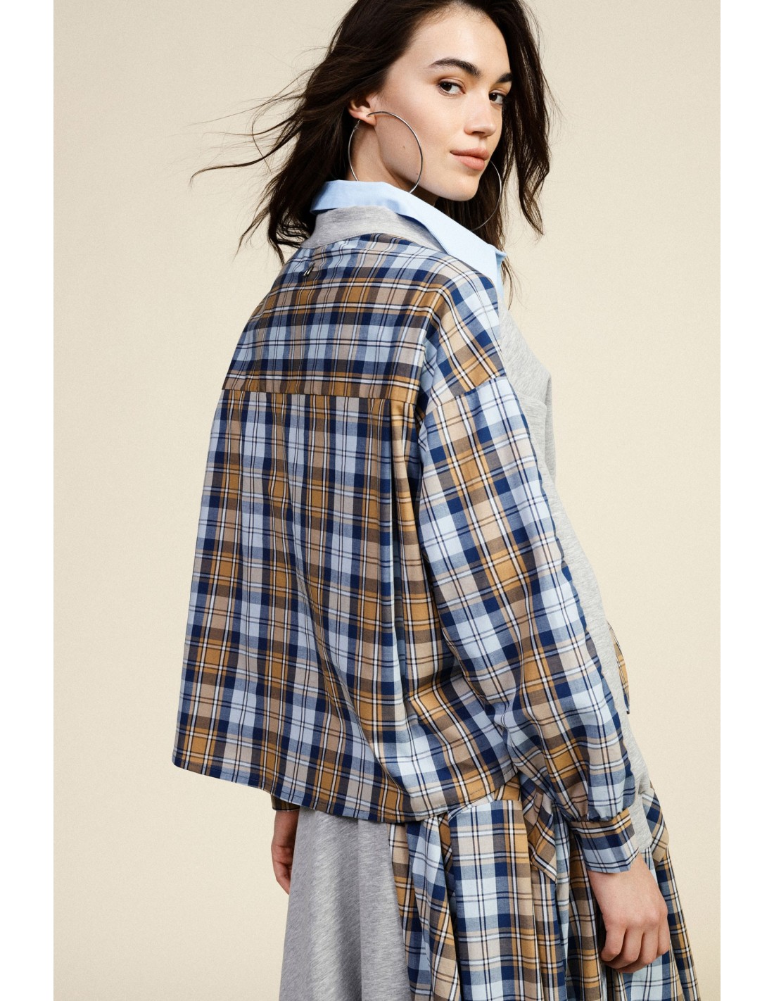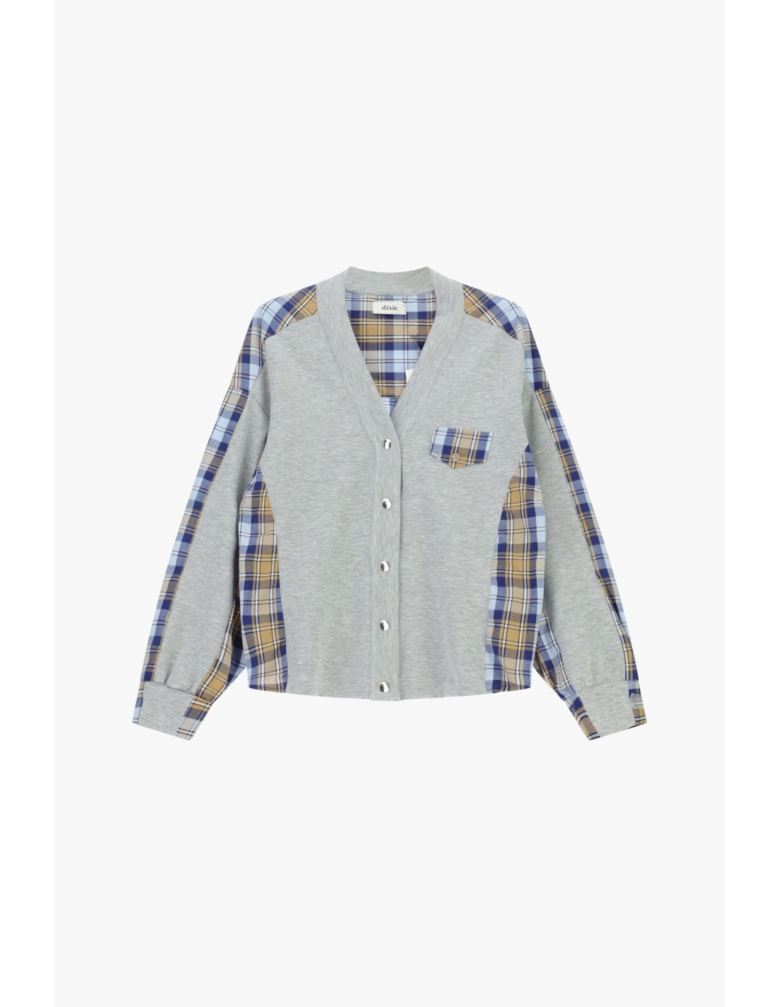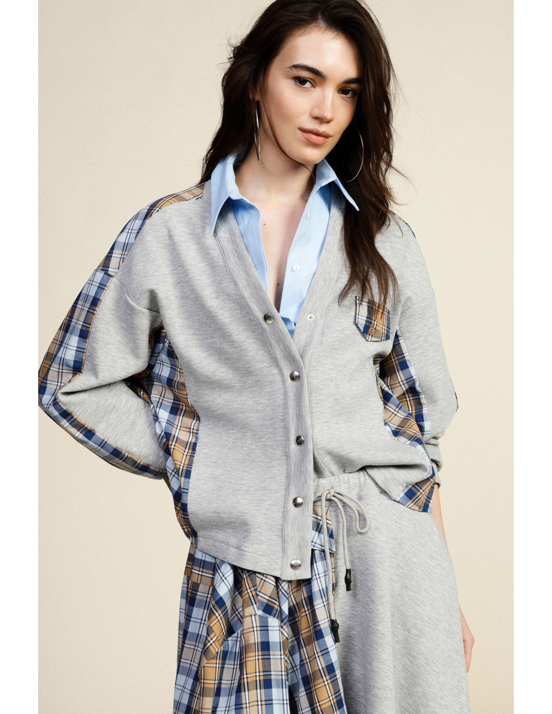 Este sweat de corte confortável combina detalhes originais com aplicações xadrez nas mangas, ombros e costas, além de um bolso aplicado. O fecho frontal com botões acrescenta praticidade e um toque distintivo, ideal para looks casuais cheios de personalidade para viver todos os dias com leveza.