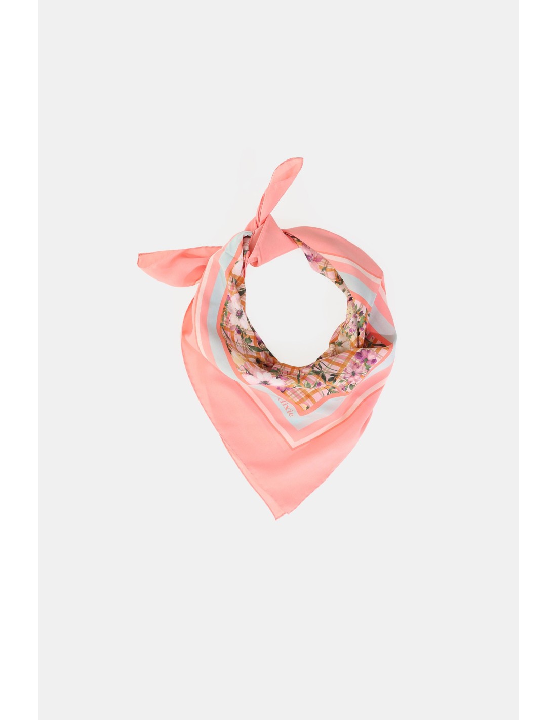 Um lenço quadrado que junta um padrão floral vivo sobre uma trama xadrez, emoldurado por uma borda em contraste. Perfeito para dar um nó ao pescoço ou no cabelo, confere um toque feminino e original a qualquer look. Adapta-se com facilidade ao quotidiano e está pronto para dar carácter até aos looks mais simples.