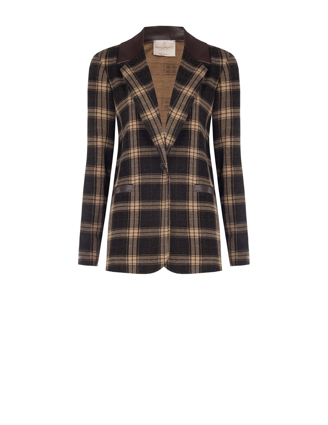 Blazer Rinascimento com corte justo que esculpe a silhueta. Confeccionado em jacquard aos quadrados, macio e estruturado, com lapelas e bordas dos bolsos em pele sintética e fecho de um só botão. Perfeito no escritório com calças de alfaiataria, impecável depois das 18 com denim ou mini-saia para um cocktail.