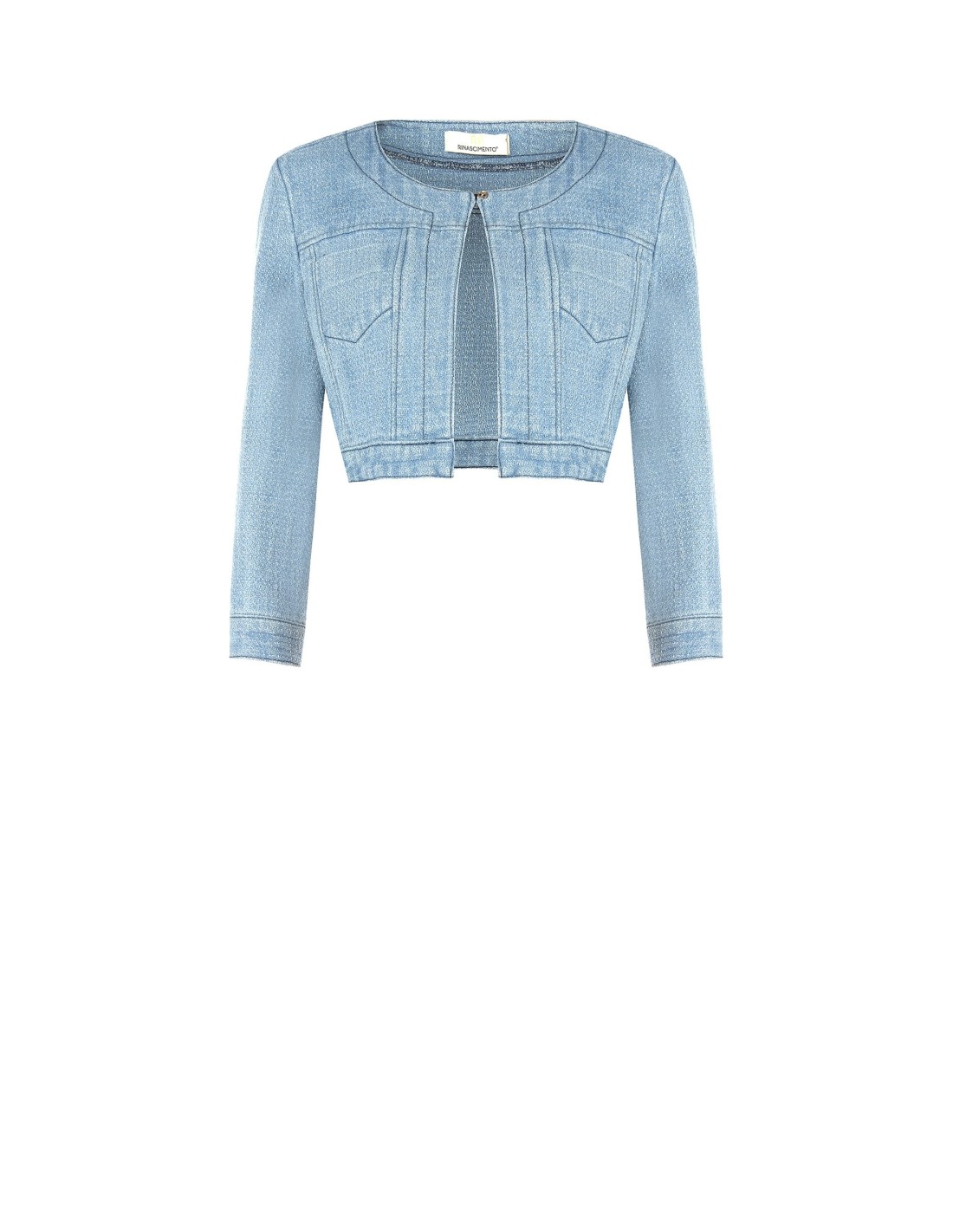Bolero curto em denim macio com fio luminoso que envolve a silhueta sem marcar. Decote redondo limpo, pequeno gancho frontal e bolsos moldados que realçam a cintura. Perfeito sobre vestidos e tops para looks de noite, festas e ocasiões especiais.