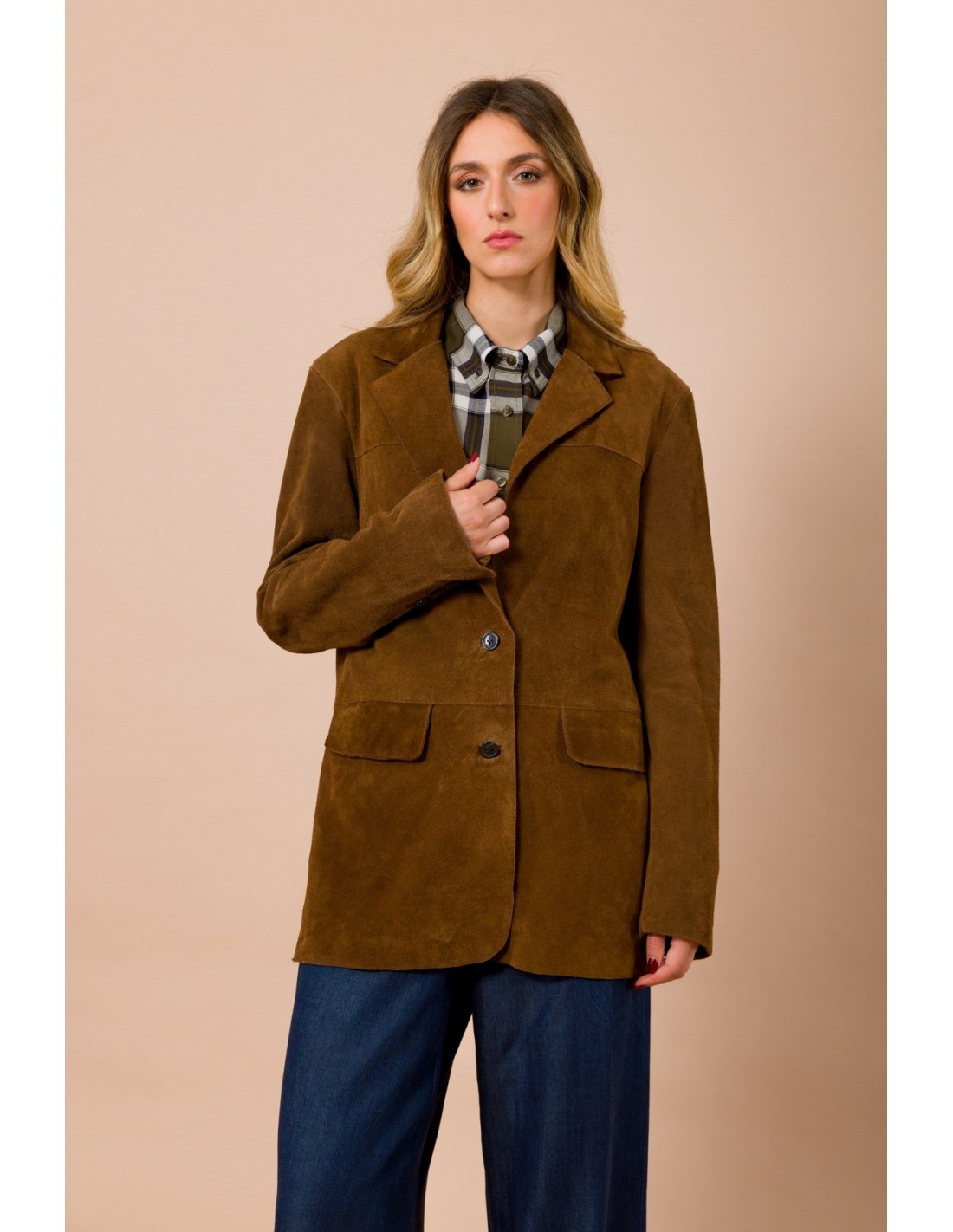 Casaco em camurça com corte cru e bolsos com aba Maryley
