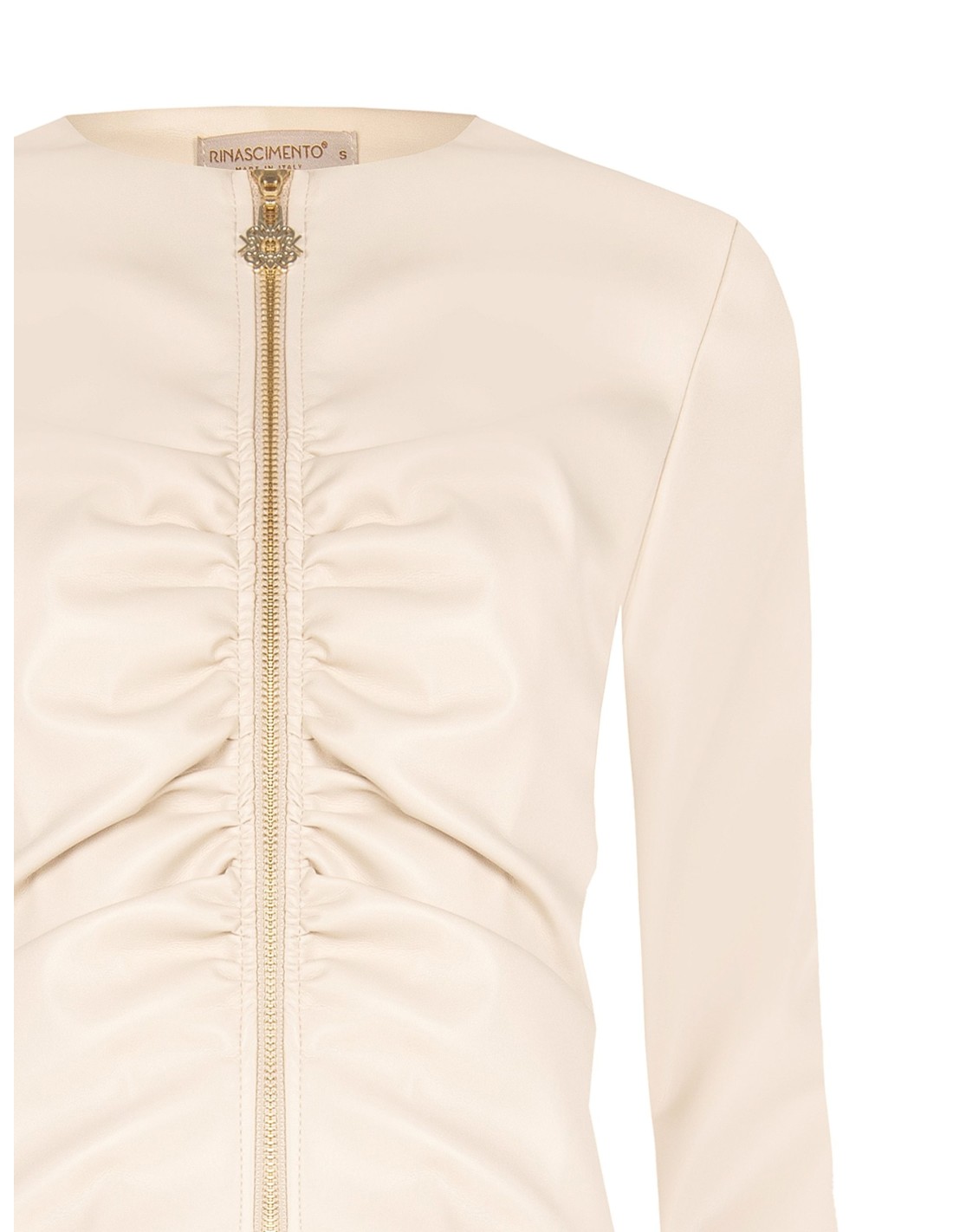 Casaco curto de corte justo, em material macio com efeito pele que envolve a silhueta sem a apertar. Os franzidos frontais valorizam a cintura, enquanto o fecho de correr metálico com puxador tipo joia confere brilho. Perfeito com vestidos e calças para o escritório e para aperitivos.