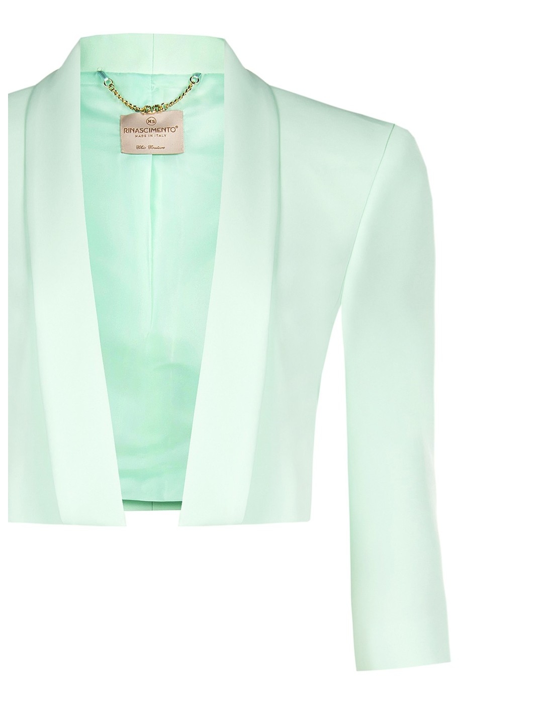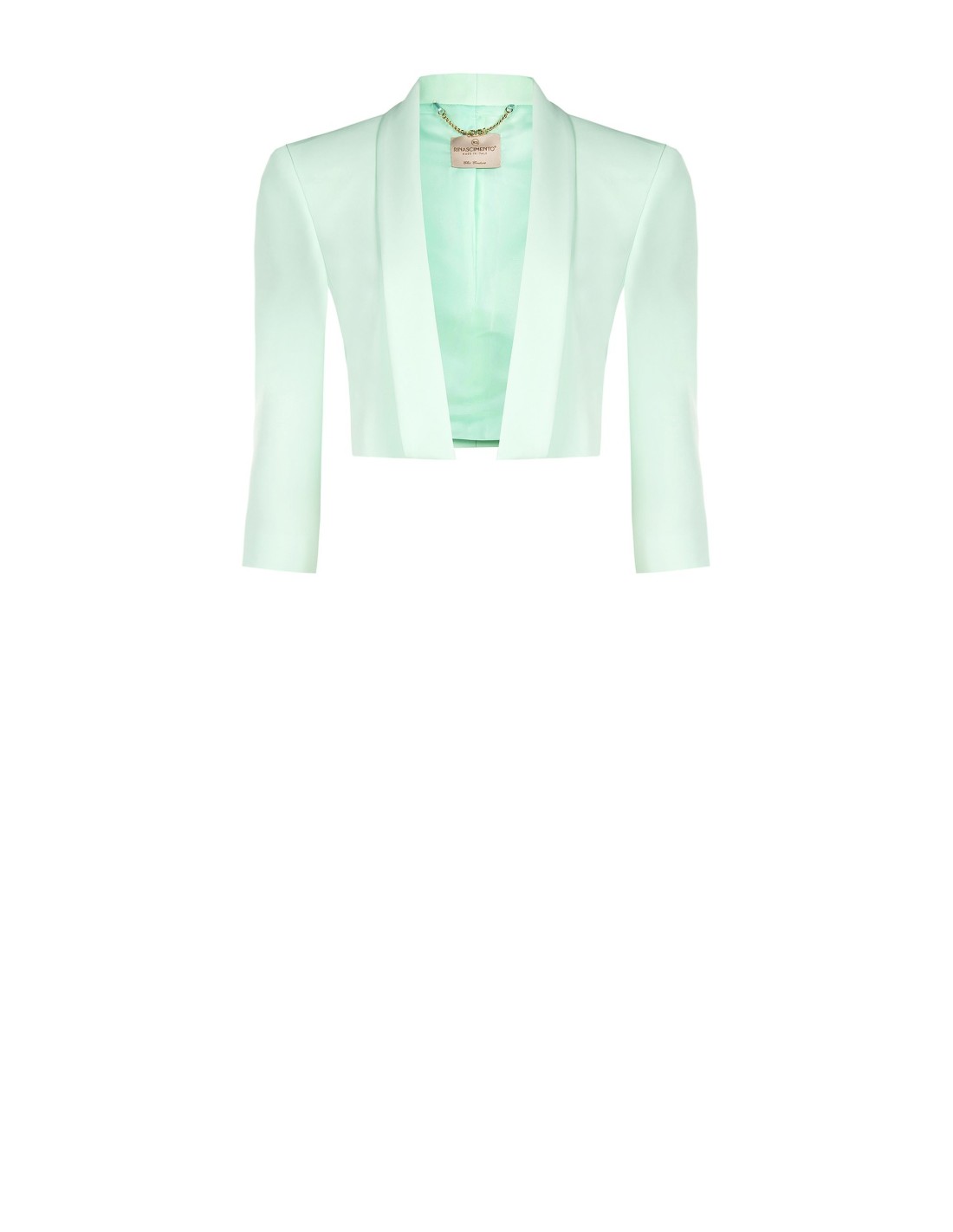 Blazer curto Rinascimento de corte justo, em tecido liso ligeiramente stretch com forro acetinado para um conforto impecável. Lapela caída e mangas três quartos alongam a silhueta. Perfeito sobre vestidos e tops para escritório, cerimónias e noites especiais.