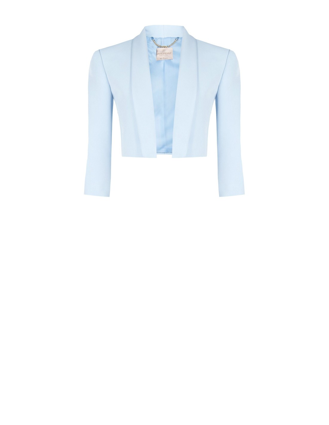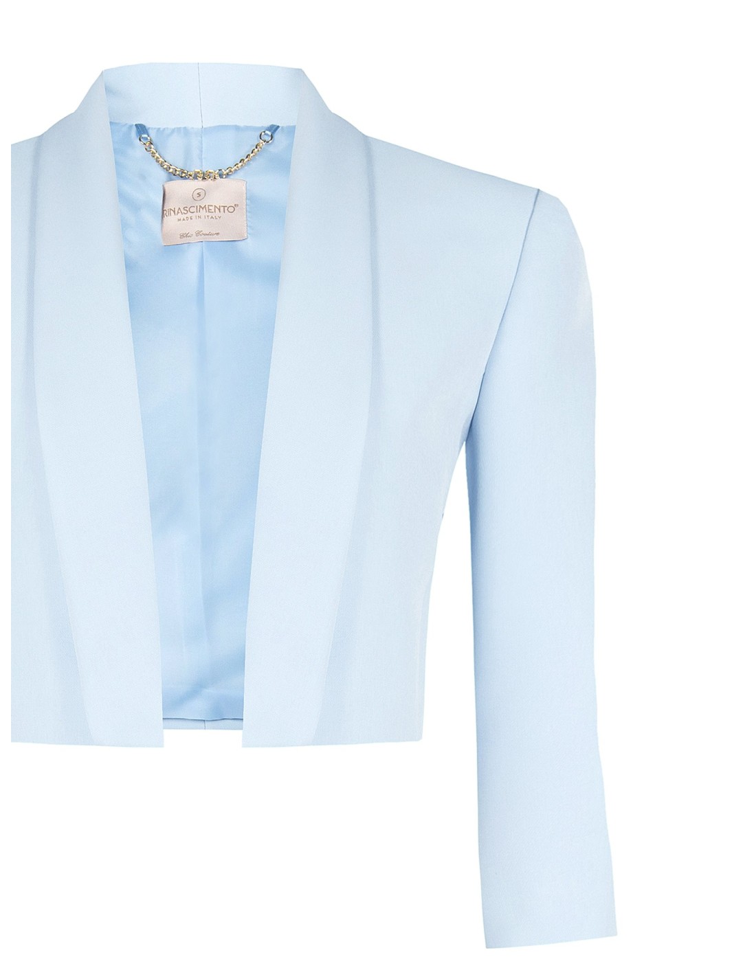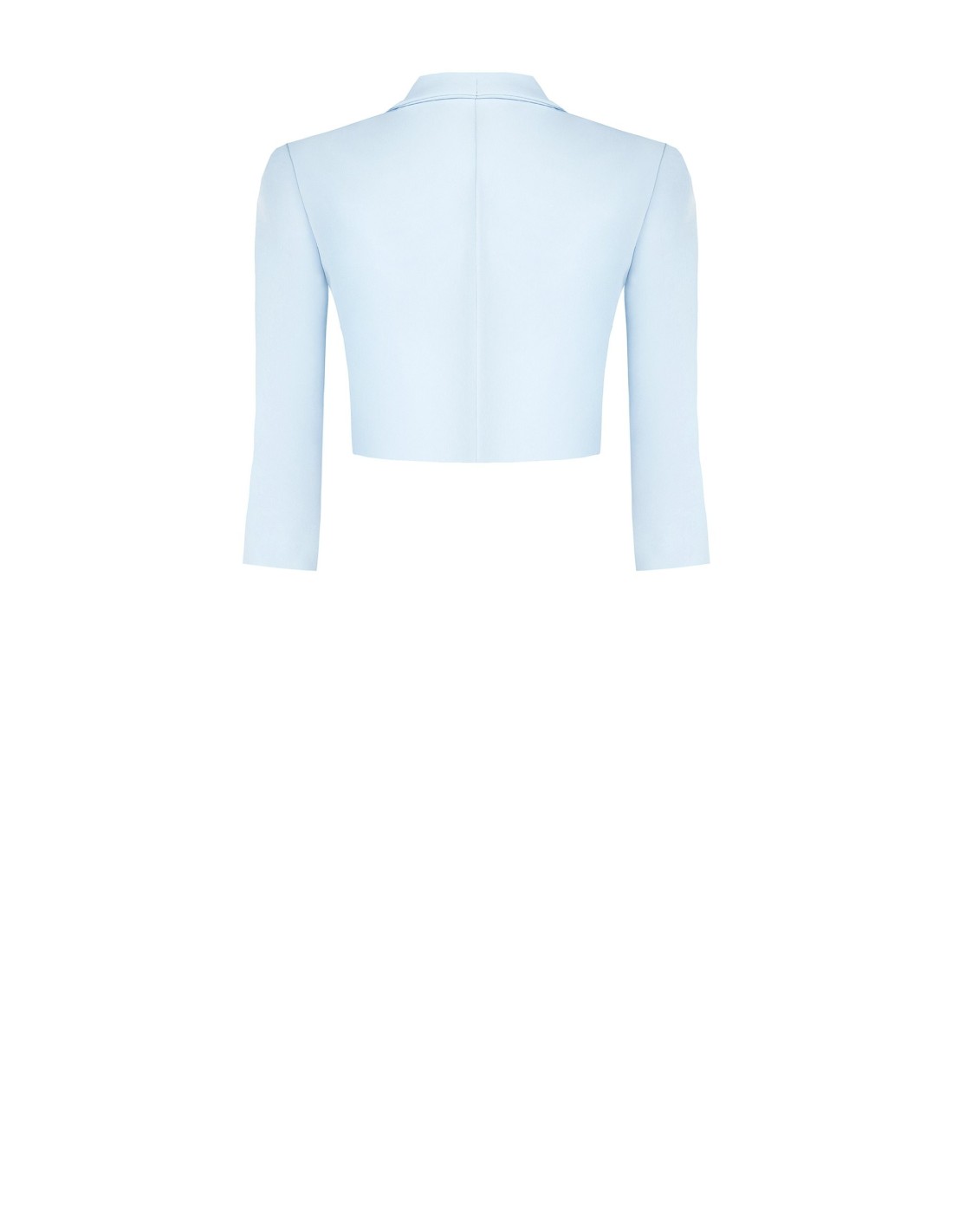 Blazer curto Rinascimento de corte justo, em tecido liso ligeiramente stretch com forro acetinado para um conforto impecável. Lapela caída e mangas três quartos alongam a silhueta. Perfeito sobre vestidos e tops para escritório, cerimónias e noites especiais.