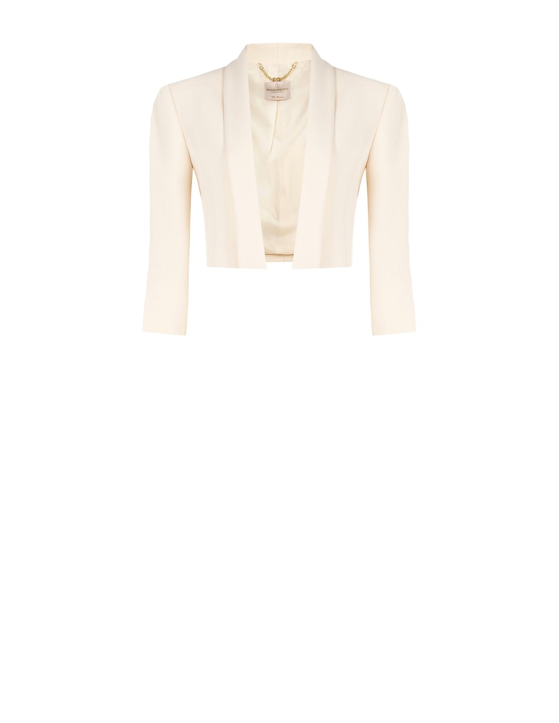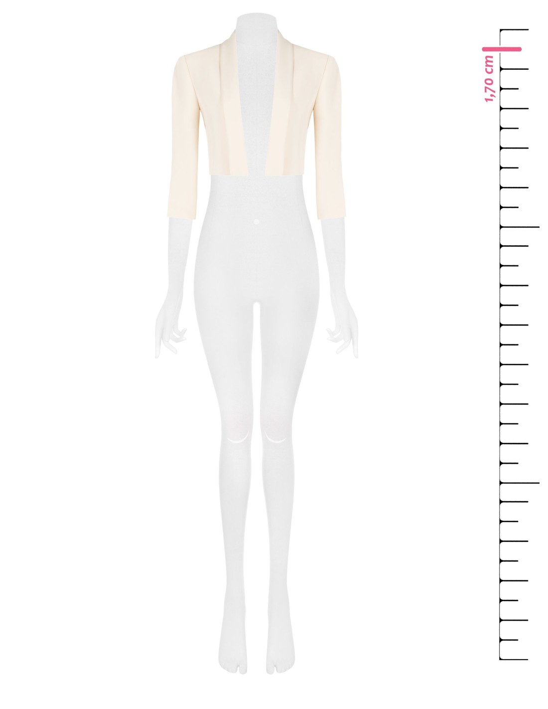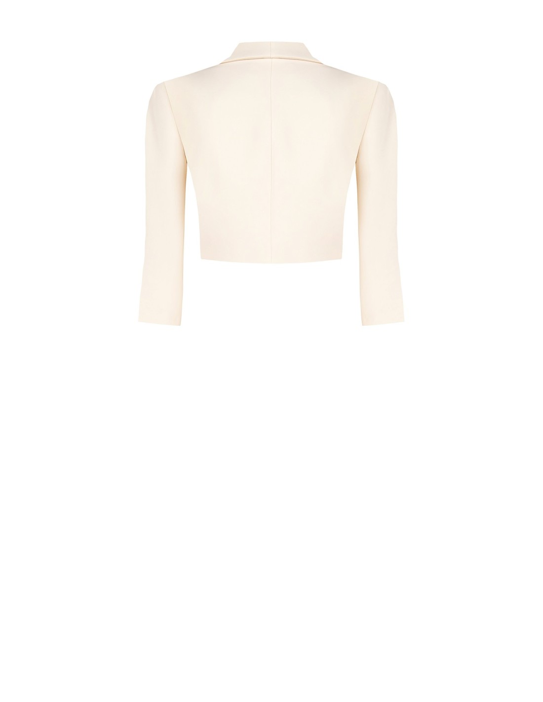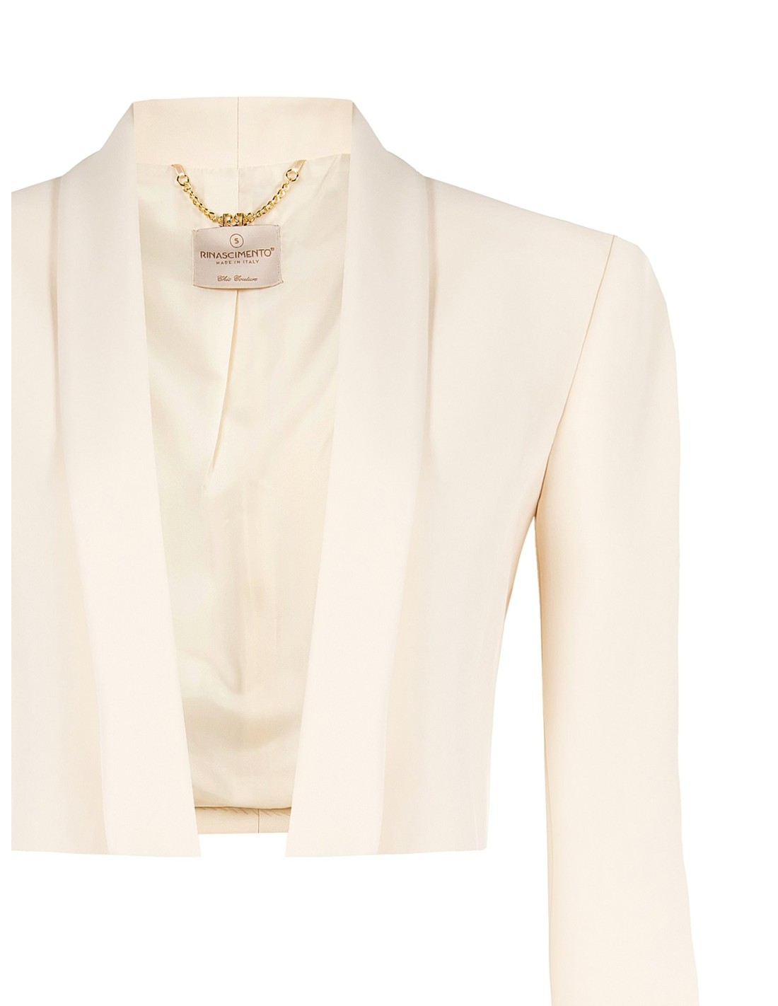 Blazer curto Rinascimento de corte justo, em tecido liso ligeiramente elástico com interior acetinado para um conforto impecável. Lapela tipo xale e mangas três quartos que afinam a silhueta. Perfeito com vestidos e tops para escritório, cerimónias e noites especiais.