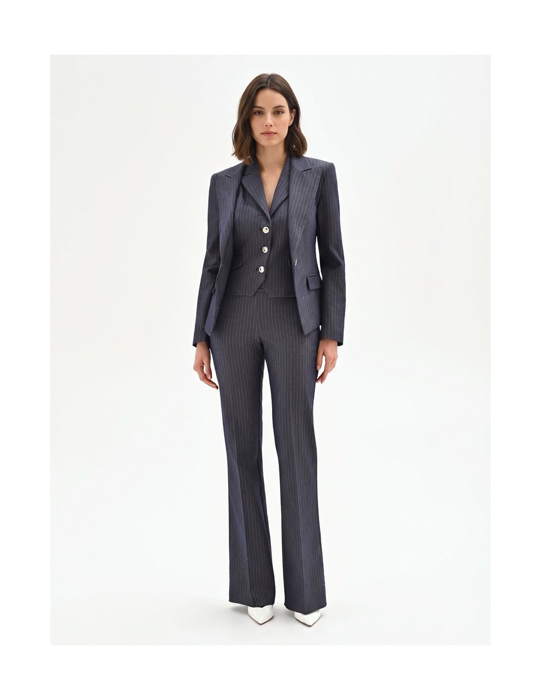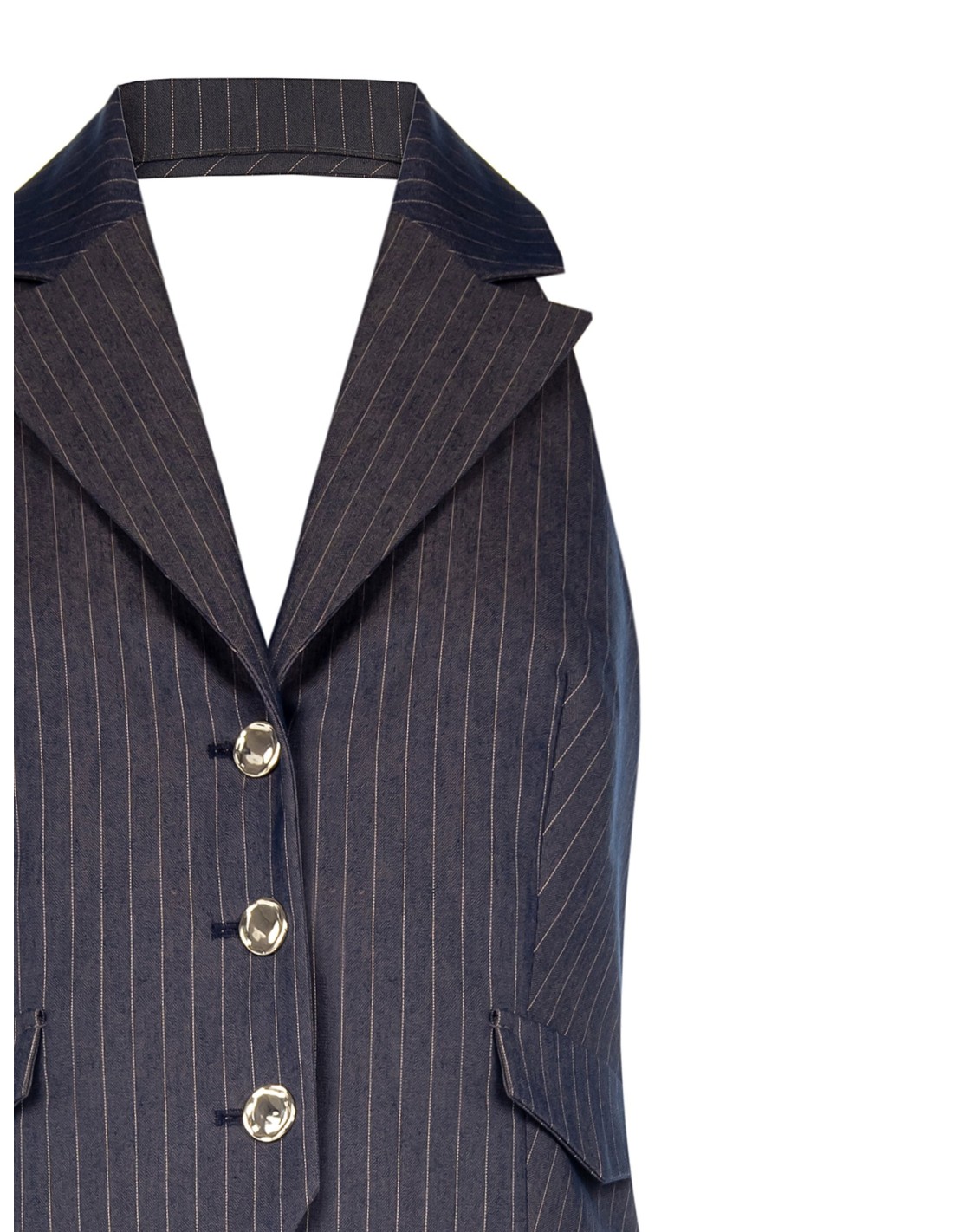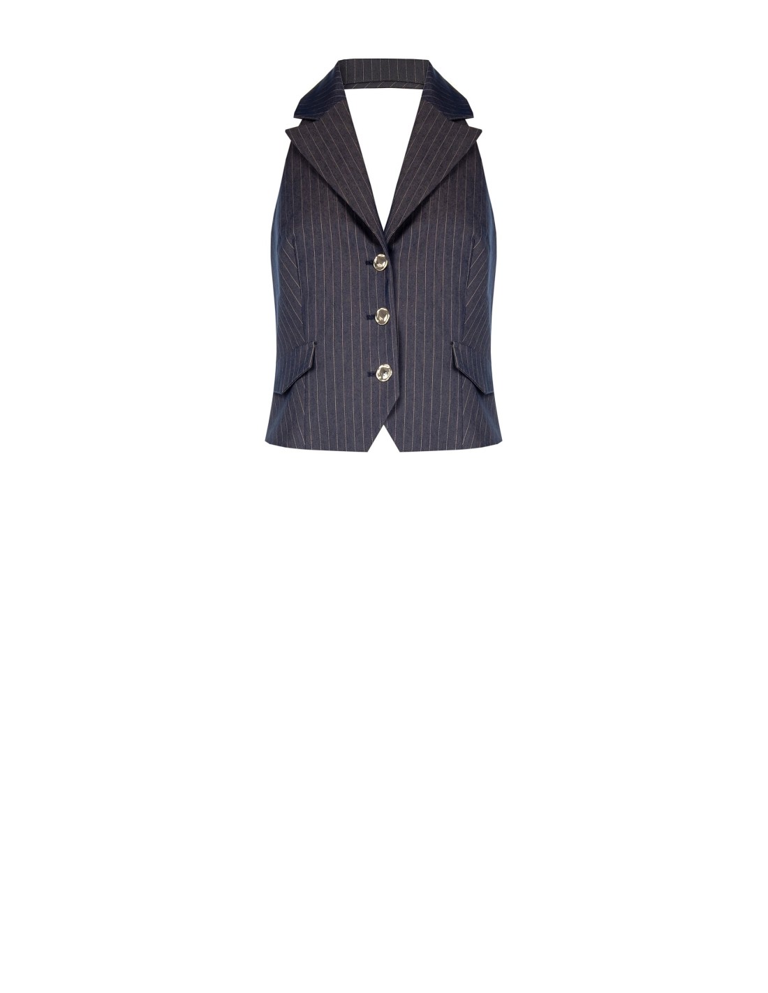 Colete sartorial justo em tecido risca-de-giz, macio mas estruturado para valorizar a cintura. Gola revere, decote profundo em V e costas valorizadas por uma faixa. Botões joia frontais. Perfeito com calças flare para o escritório ou com jeans e saltos para um aperitivo.