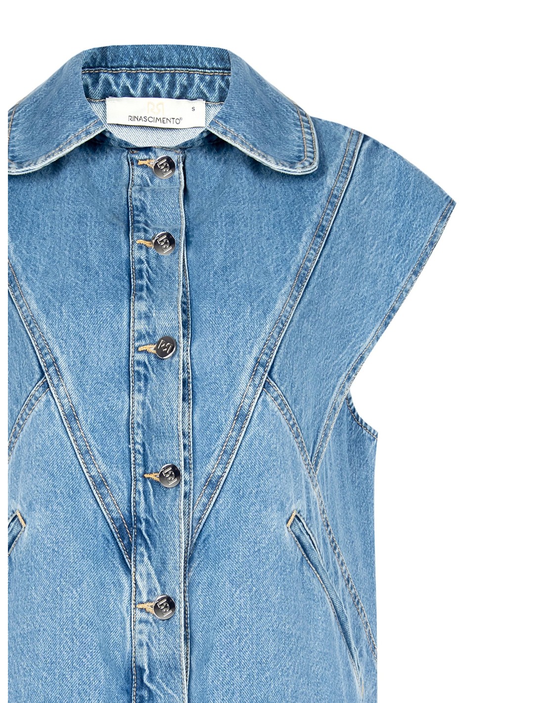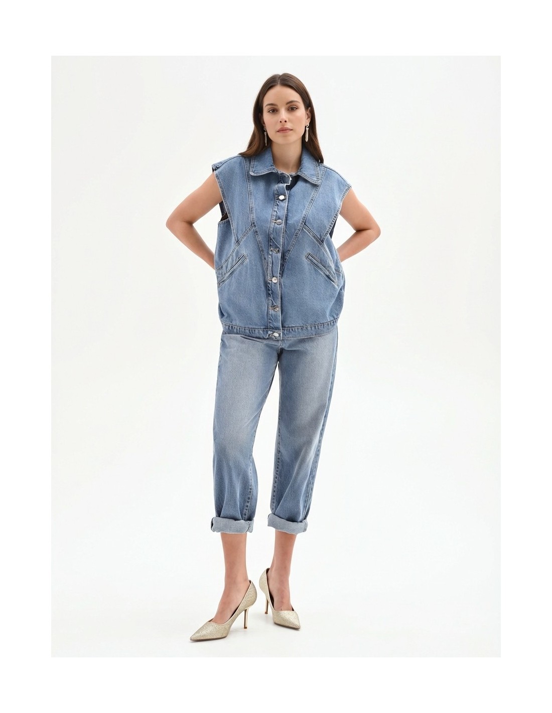Peça em denim com corte macio e direito, ideal para sobrepor tops e vestidos. As costuras em V esculpem a silhueta, o maxi colarinho e os botões à vista acrescentam carácter. Perfeito para looks do dia a dia com um toque urbano, do fim de semana na cidade ao aperitivo.