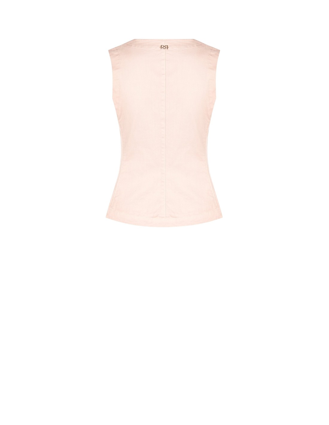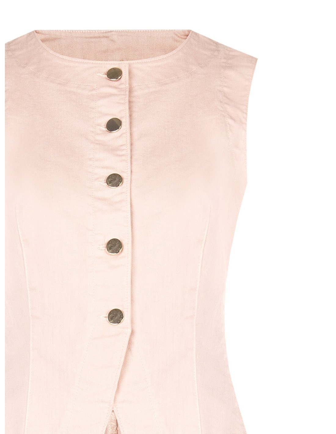 Peça sem mangas de corte justo que modela a silhueta, em tecido leve de toque macio. Gola redonda essencial, botões metálicos e pequena abertura frontal para uma feminilidade discreta. Perfeita com calças ou saias, do escritório ao aperitivo.