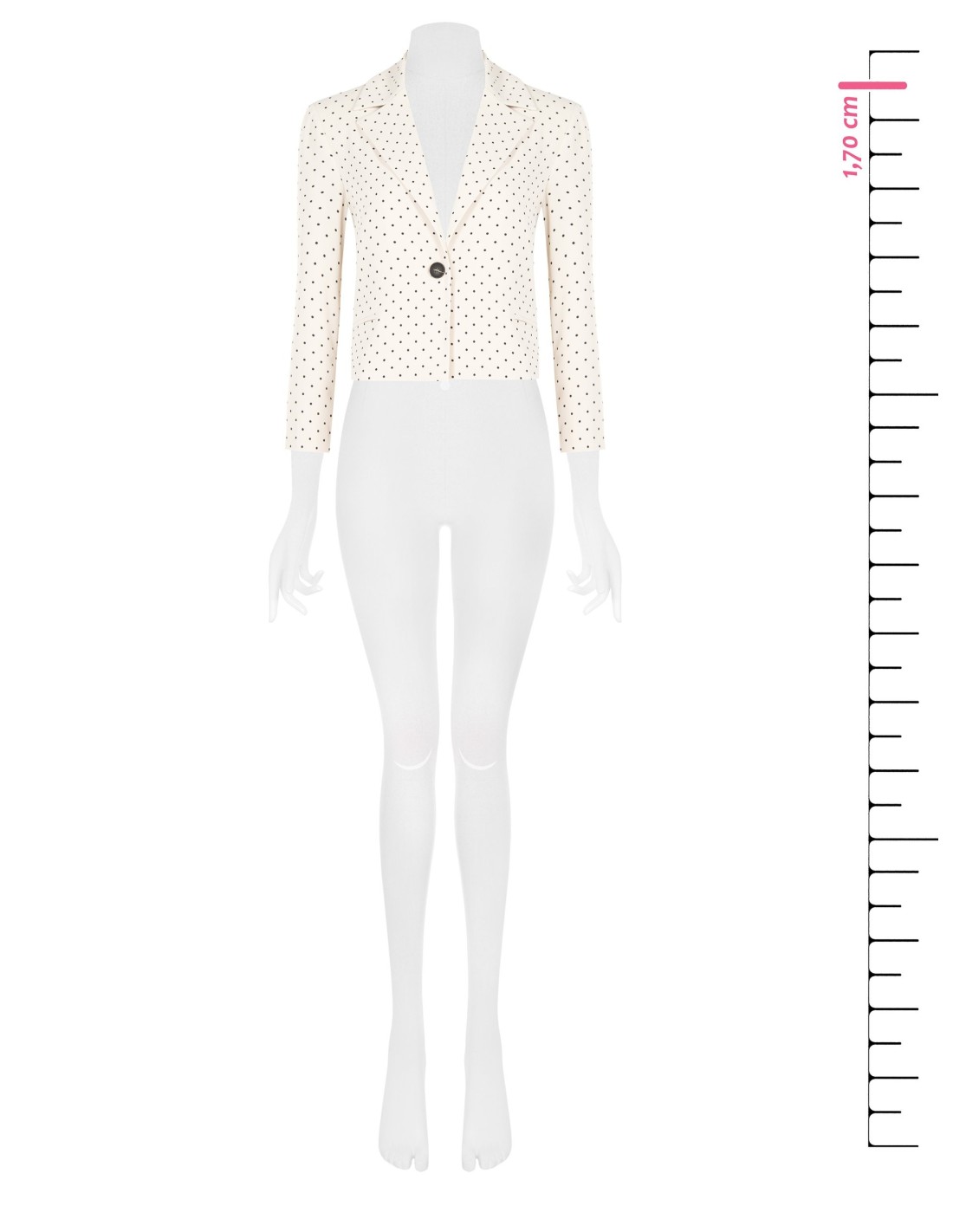Blazer curto Rinascimento com corte ajustado que realça a cintura, em tecido macio e ligeiramente estruturado. Motivo de micro poás, revers clássico e fecho monopetto com botão joia. Perfeito com calças ou vestidos para escritório, aperitivo e ocasiões especiais.