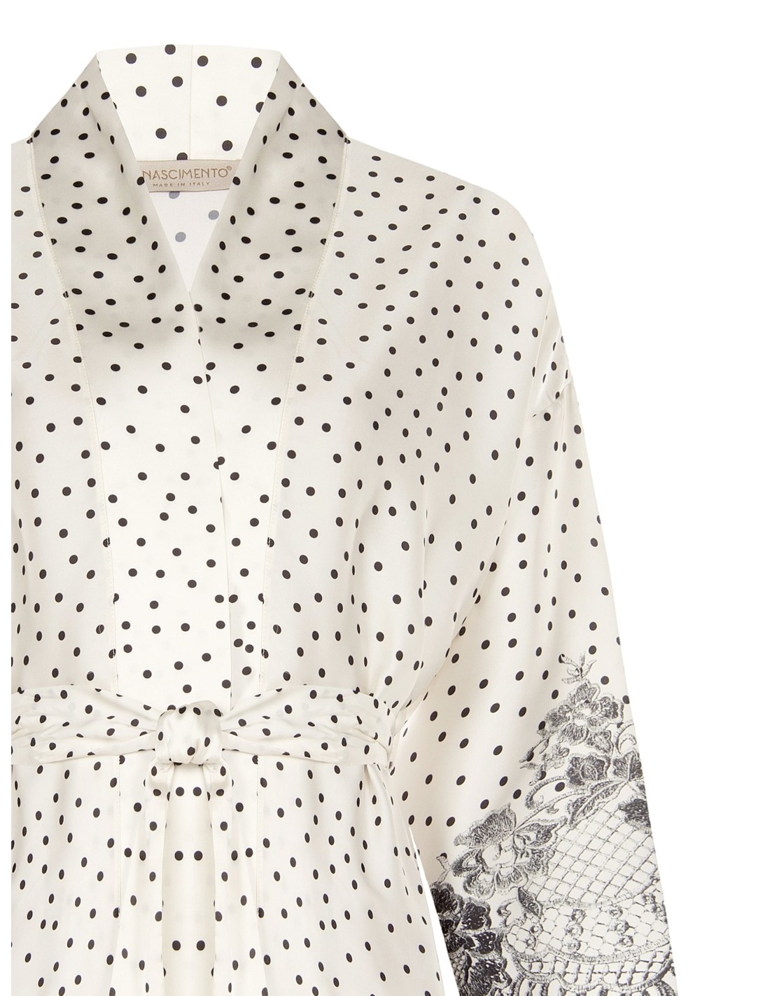 Sobreposição de corte macio e fluido, em cetim de toque sedoso com estampado de bolinhas. A pala de estilo xale e o cinto para atar na cintura valorizam a silhueta com conforto e leveza. Perfeito para festas, ocasiões especiais ou looks chiques de noite.