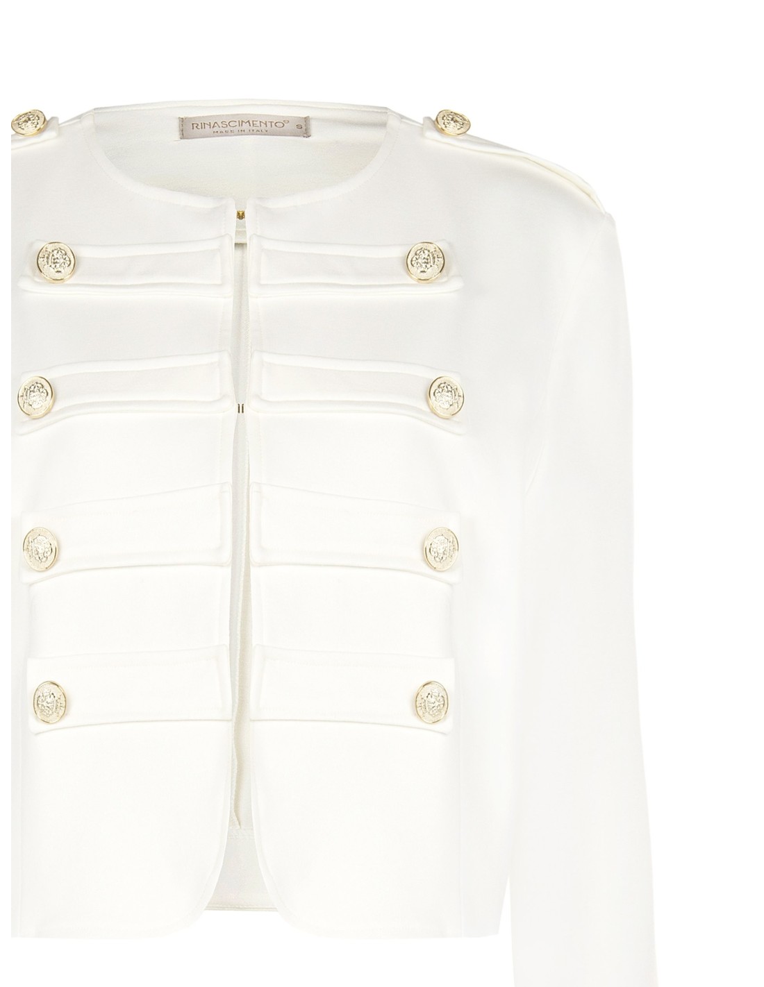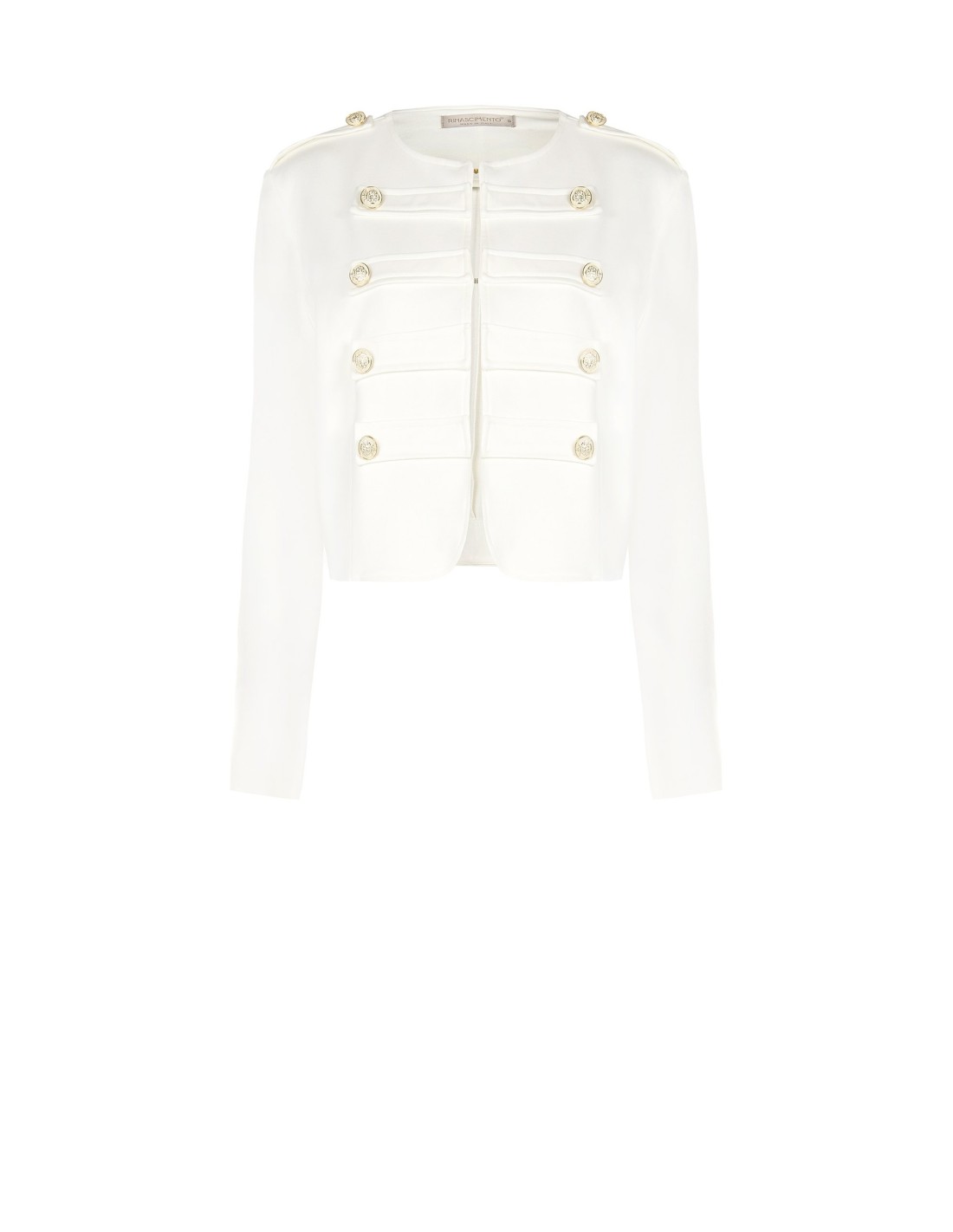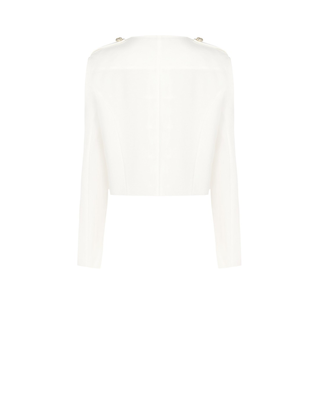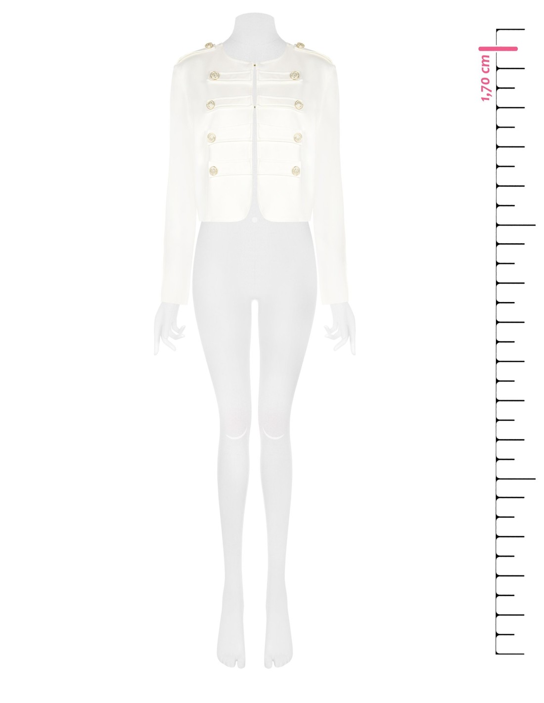Blazer curto com um corte estruturado e feminino, em tecido compacto com toque liso que valoriza a silhueta sem renunciar ao conforto. Decote redondo, fecho de correr escondido e botões tipo joia decorativos para um toque requintado. Perfeito para escritório, ocasiões especiais e festas.